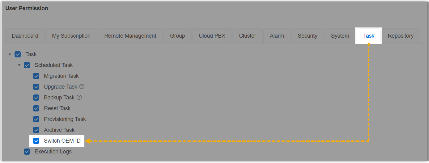 P-Series Software Edition.Note: This permission setting is only available when you have the permission to switch PBX's OEM ID. For more information, contact Yeastar.