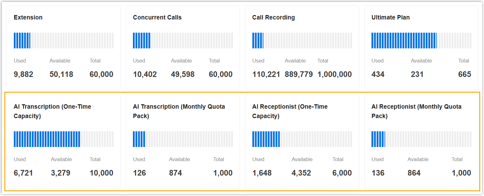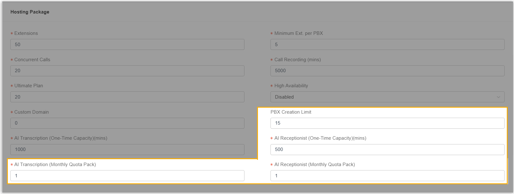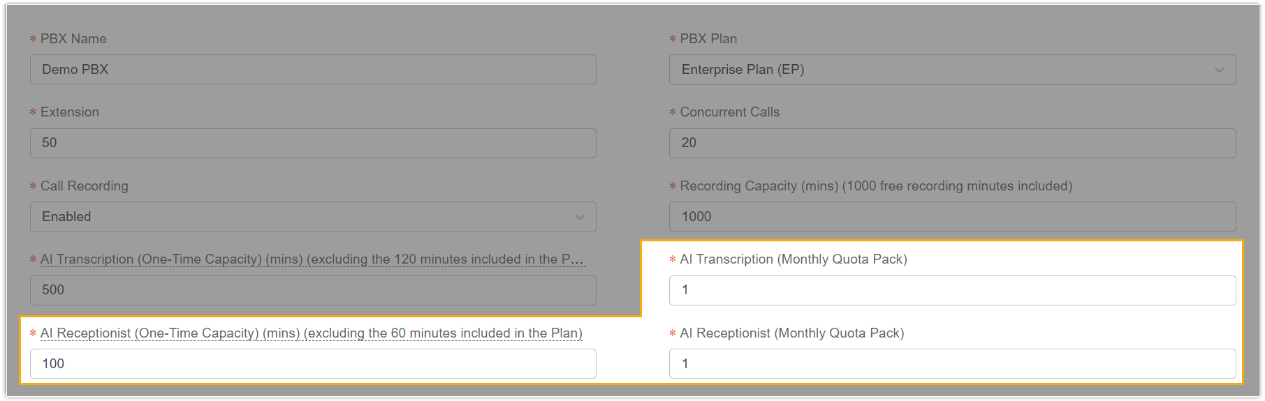 Setting Description AI Transcription (Monthly Quota Pack) Assign the number of monthly quota packs for AI transcription. Each pack provides a fixed quota of 500 minutes that resets each month. AI Receptionist (One-Time Capacity) Assign the number of one-time AI receptionist minutes (excluding the one-time free minutes included in the PBX subscription plan.). AI Receptionist (Monthly Quota Pack) Assign the number of monthly quota packs for AI receptionist. Each pack provides a fixed quota of 200 minutes that resets each month. For more information, see Create a P-Series Cloud PBX.