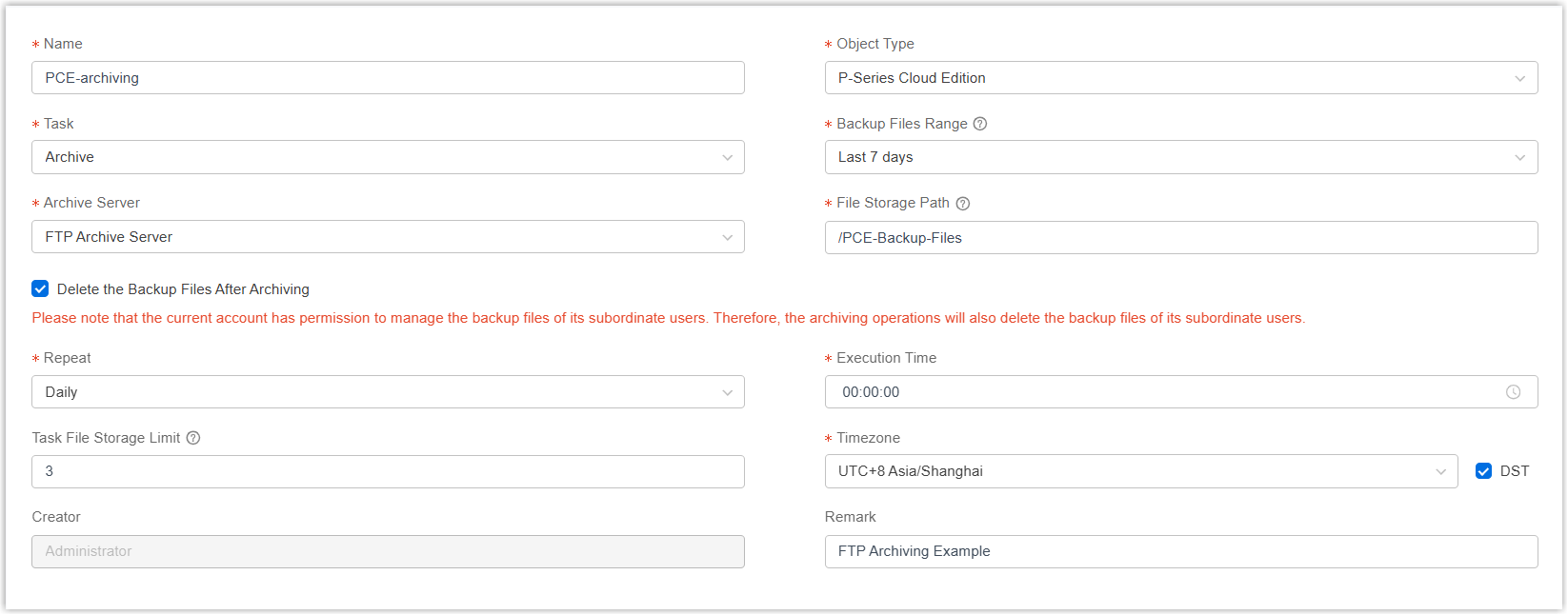 Setting Description Name Enter a name to help you identify the task. Object Type Select P-Series Cloud Edition. Task Select Archive. Backup File Range Specify a time range of the backup files to be archived. Note: You can archive files for up to 31 days at a time.Archive Server Select the FTP server that you have added. File Storage Path Set the path to the folder in which you want to store archived files. For example:- Enter