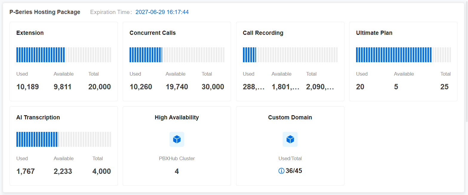 subscribed capacity (such as extensions, concurrent calls, call recording