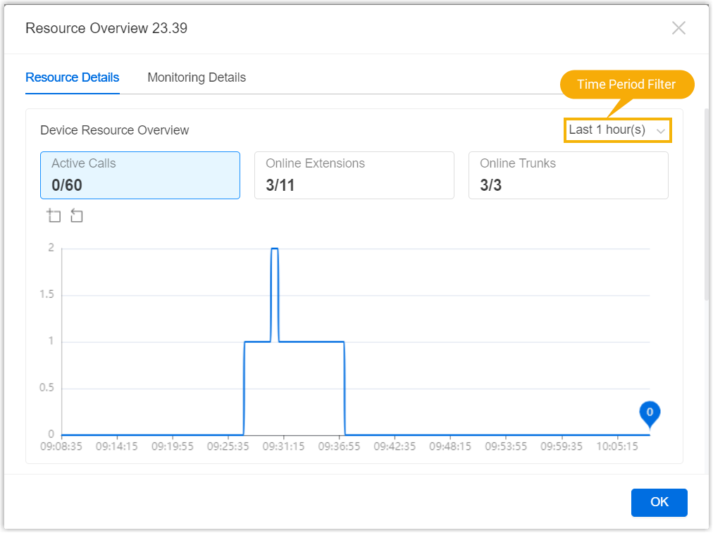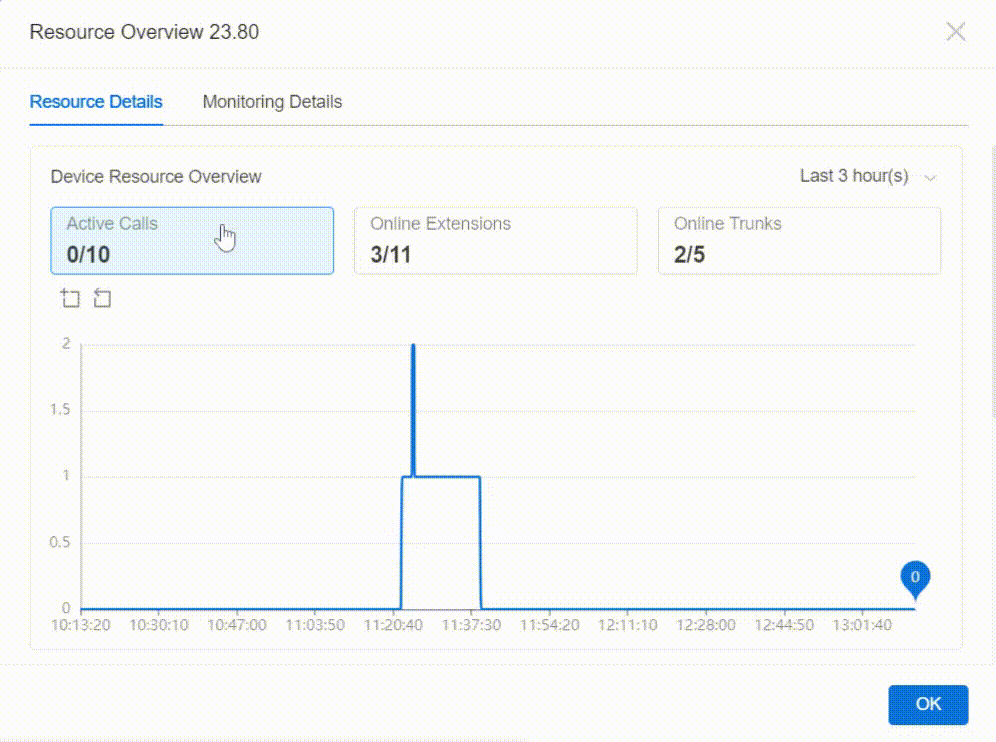 In the field, check the current utilization of active calls (concurrent calls), extensions, and trunks on the PBX system in the last 1 hour, 3 hours, 6 hours, 12 hours, or 24 hours.