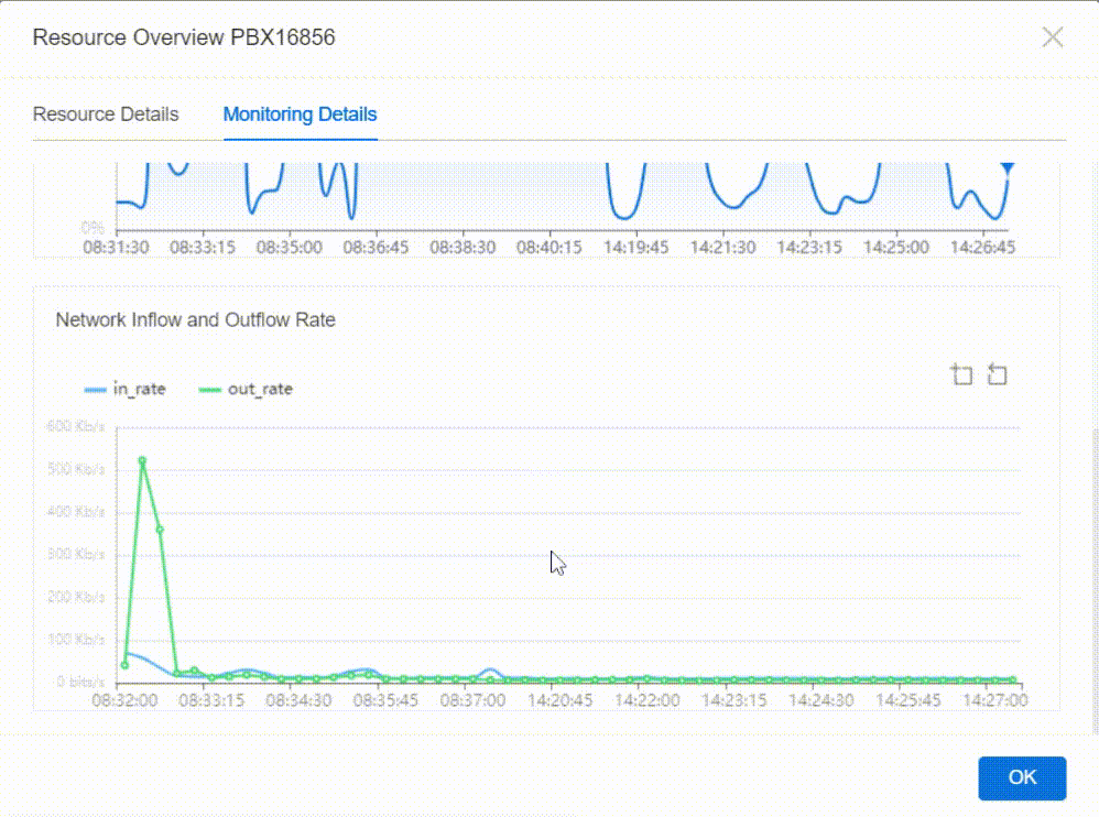 In the field, check the resource utilization and disk usage of the PBX in the last 1 hour, 6 hours, 12 hours, 24 hours, the last 3 days, 7 days, 14 days, or in a custom time period of up to 30 days.