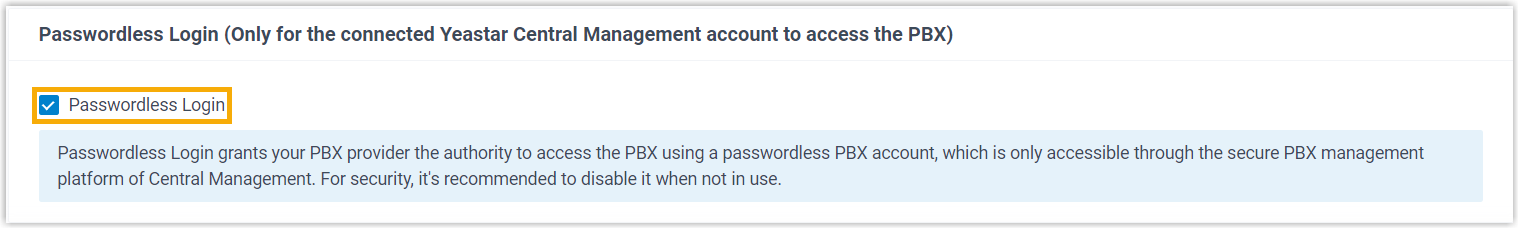 Note:- Permissions of the Passwordless account are the same as that of PBX super administrator.