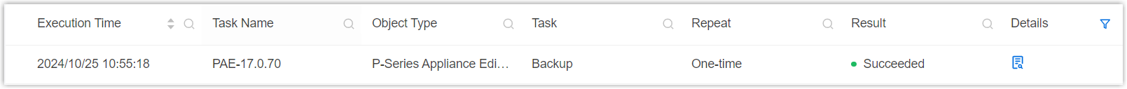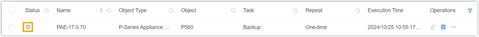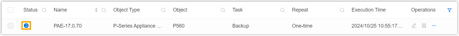 Repeat Retain One-time. Execution Time Select the checkbox of Immediately. Timezone Select a time zone of the task execution time. Tip: You can enable or disable Daylight Saving Time (DST) as needed.Creator Your name is automatically filled in, and the field can not be edited. Remark Optional. Add a note to the task. Object The Selected box lists the P-Series Appliance/Software Edition that you have selected.