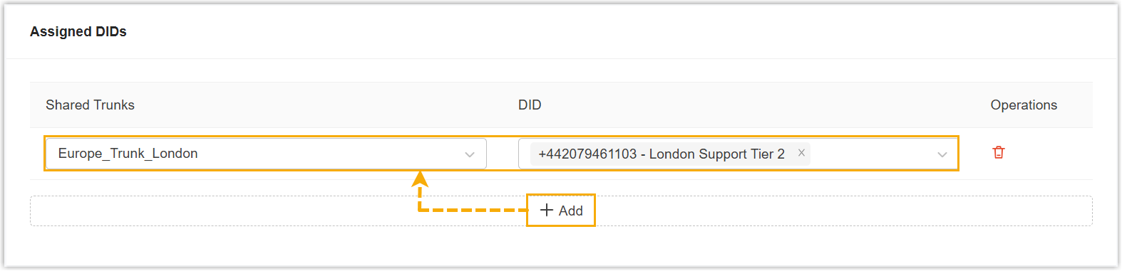 Optional: In the Assigned DIDs section, click Add to assign DID numbers to the PBX for trunk sharing.