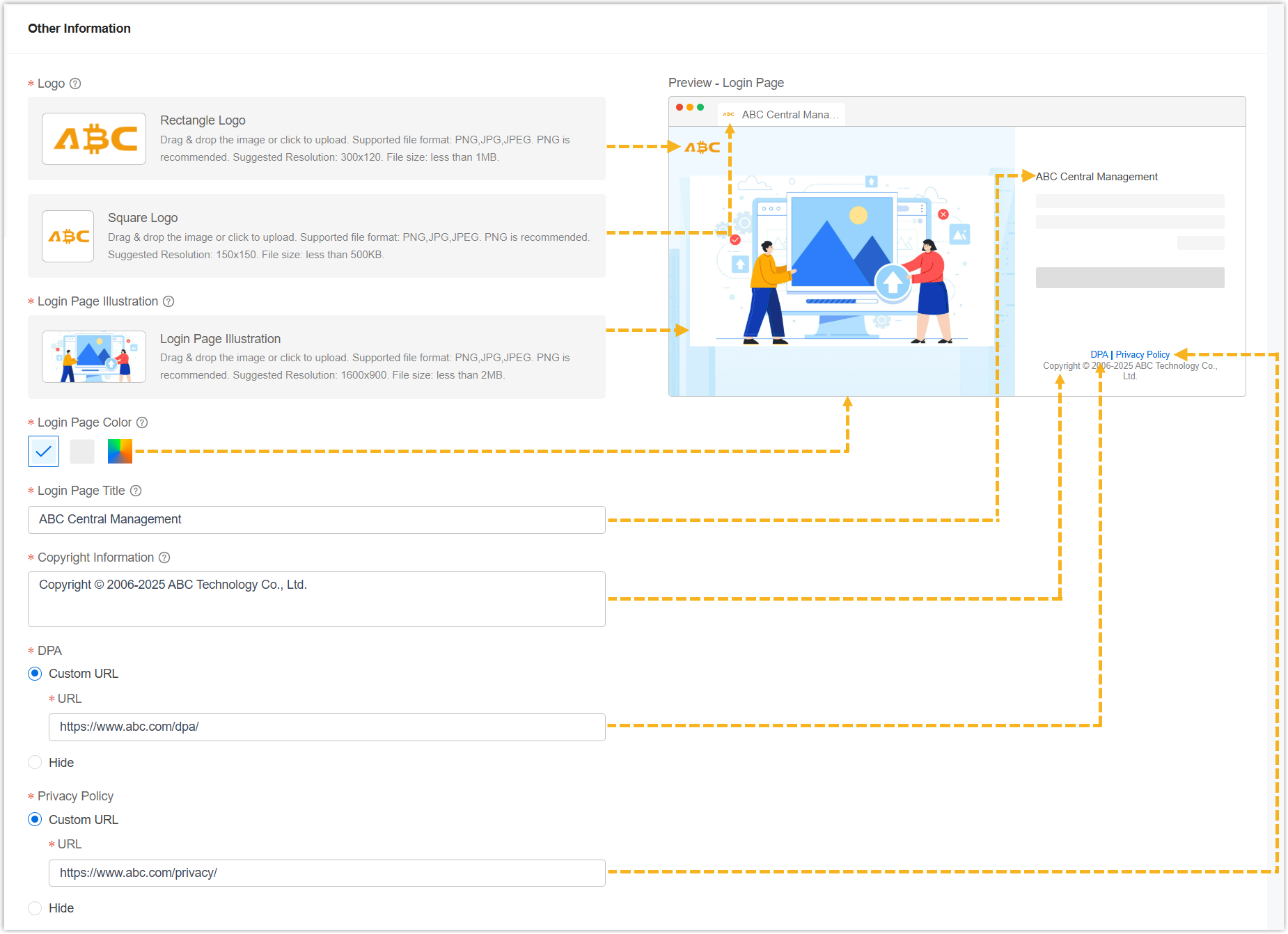 Login Page Color Select the background color of the login page illustration. Login Page Title Specify the title of the login page. Copyright Information Enter copyright information, which will be displayed on the bottom of the portal login page. DPA Specify the data processing agreement. Privacy Policy Specify the privacy policy. Email