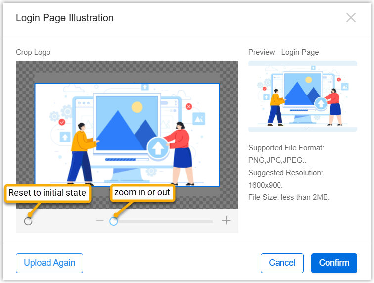 Login Page Illustration Upload an image, which will be displayed on the left of portal login page. Note: The image file should meet the following requirements:- File format: PNG, JPG, or JPEG