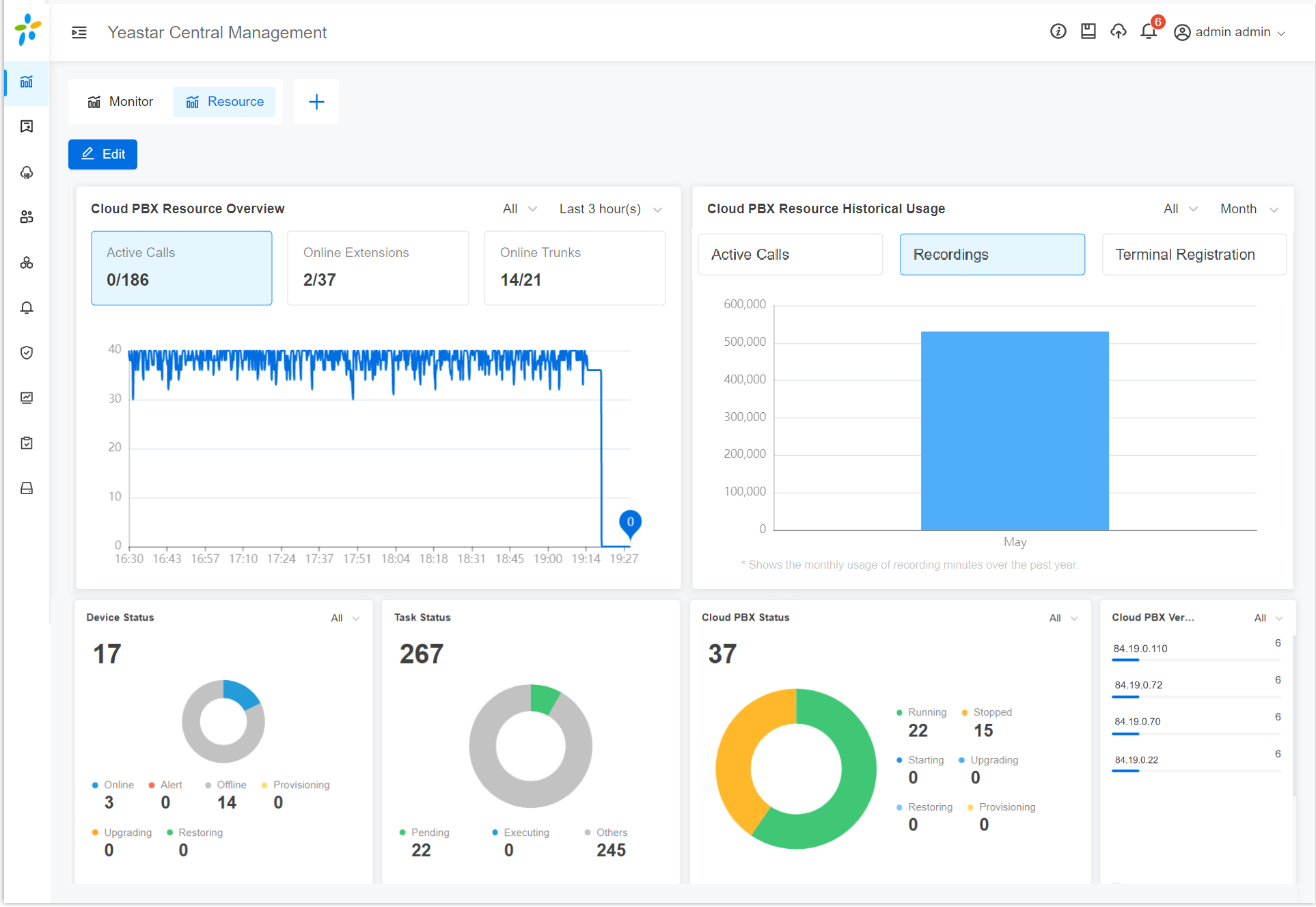 Dashboard is a collection of widgets that present you a real-time view of key information and health status about your Yeastar Central Management, and allows you to quickly access specific features within clicks.