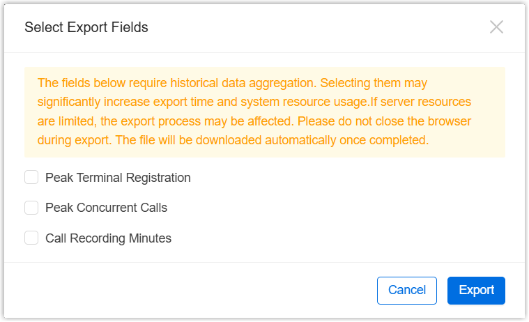 - Peak Concurrent Calls: Select to export monthly peak concurrent calls.