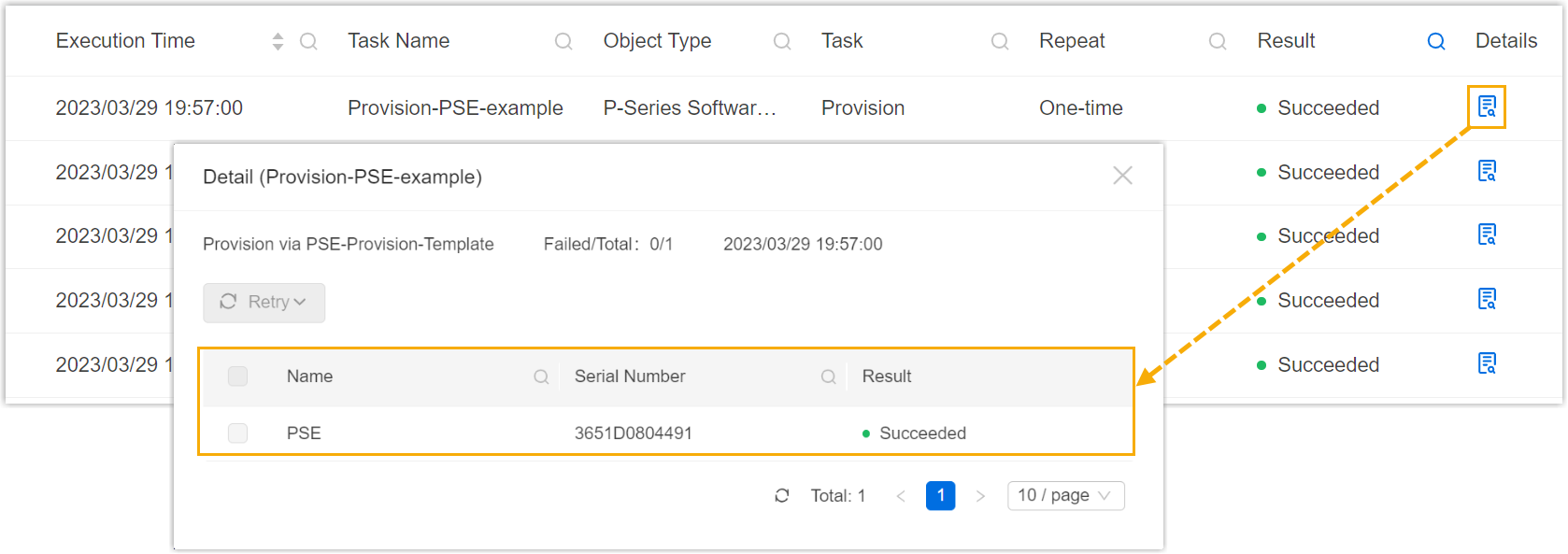 Timezone Select a time zone of the task execution time. Tip: You can enable or disable Daylight Saving Time (DST) as needed.Creator Your name is automatically filled in, and the field can not be edited. Remark Optional. Add a note to the task. Object Select one or more P-Series PBXs that you want to provision. Important: The device connection must be active upon the execution time, or the provision would FAIL. - Click Save.
