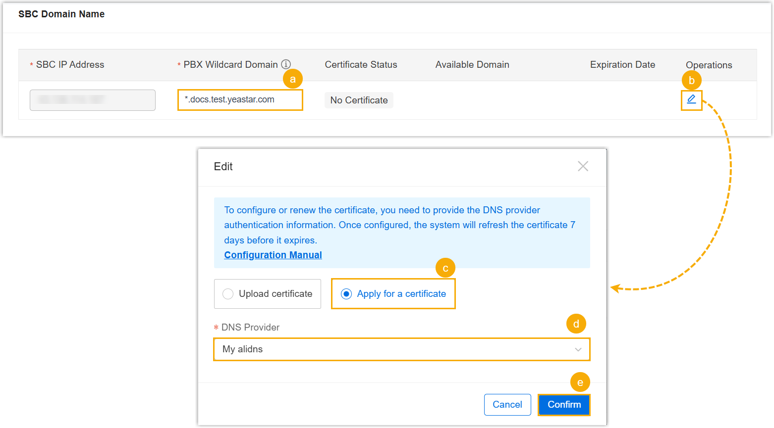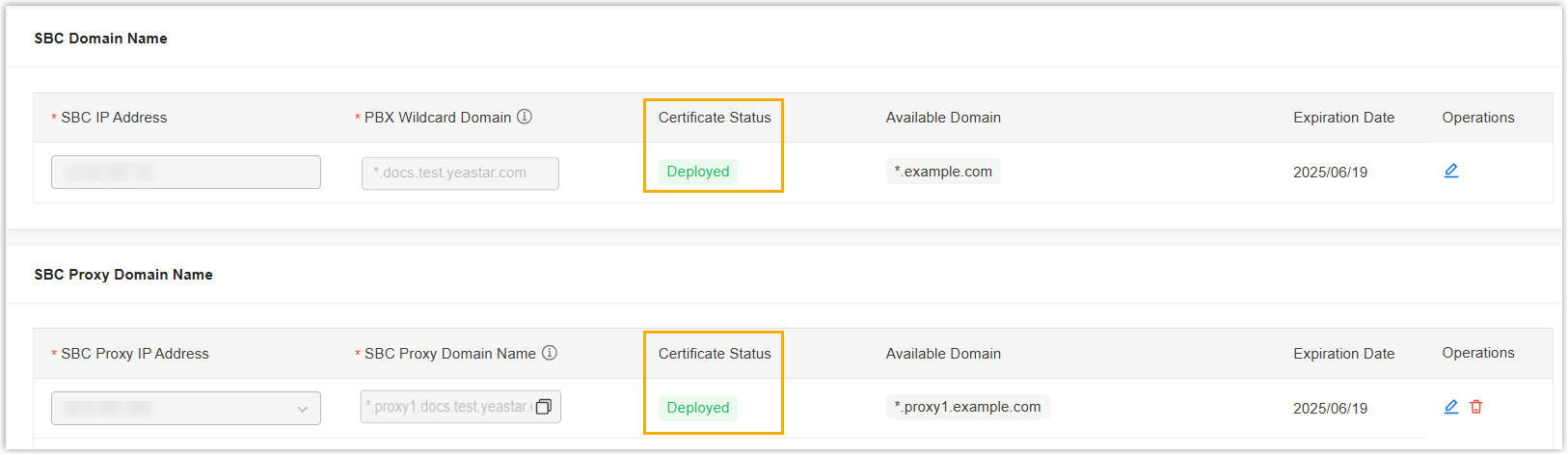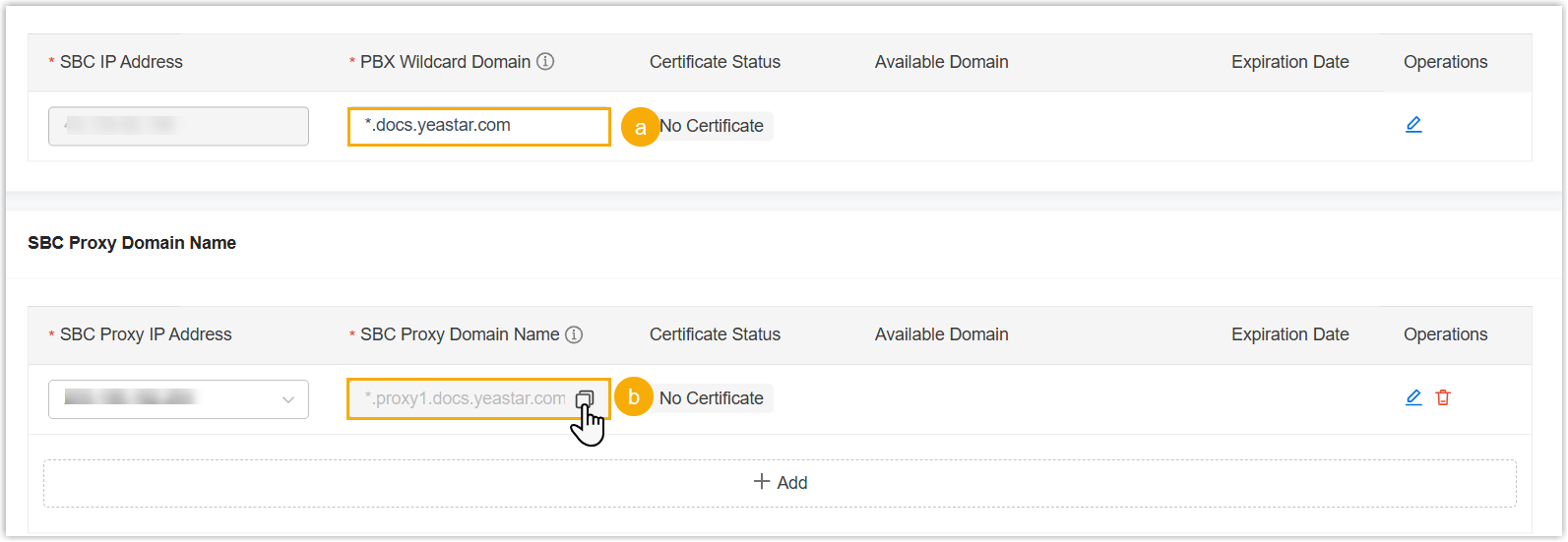 Domain name IP address PBX wildcard domain name *.docs.yeastar.comSBC IP address 123.123.123.123.SBC Proxy domain name *.proxy1.docs.yeastar.comSBC Proxy IP address 124.124.124.124