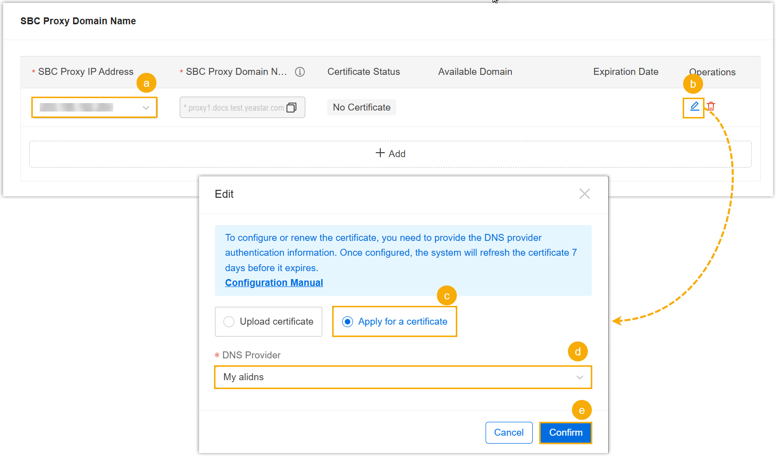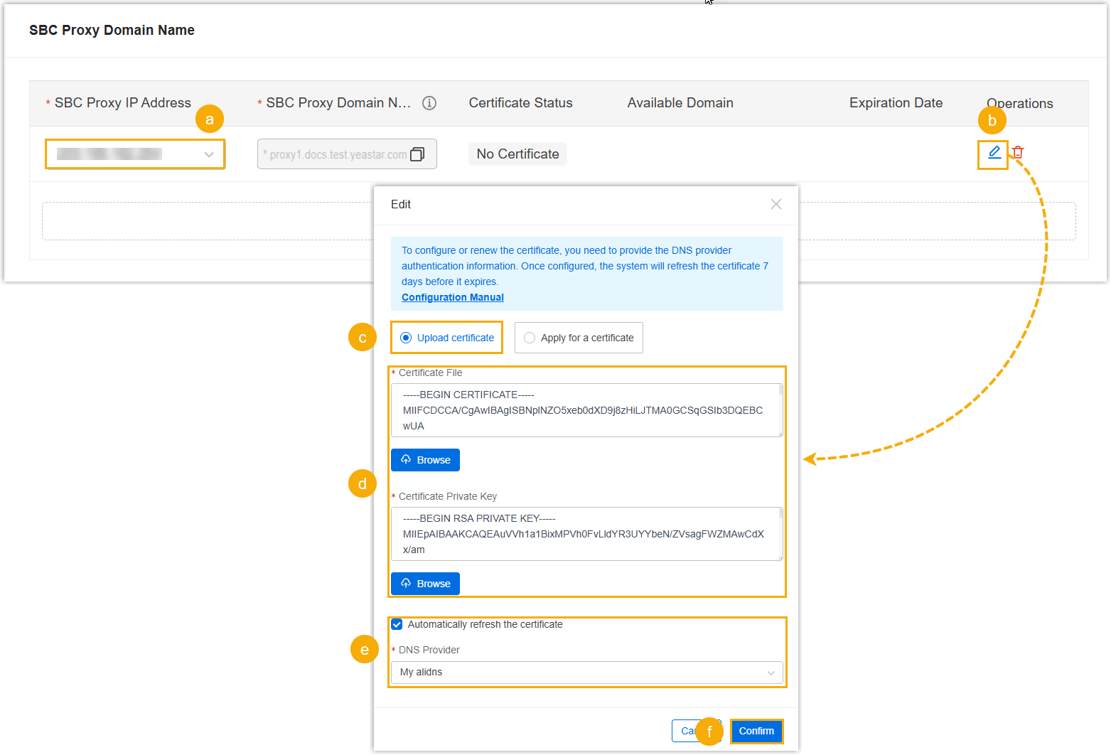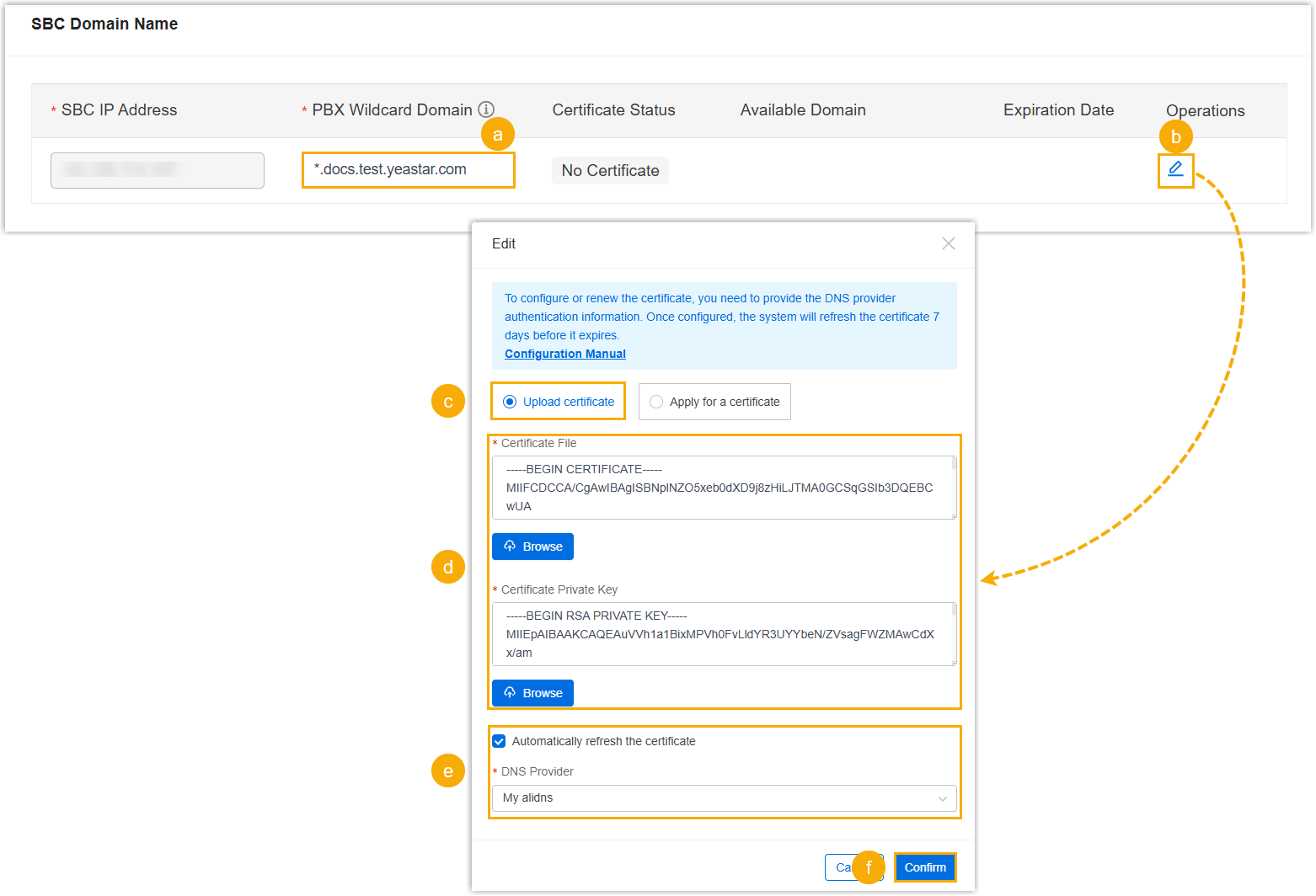 Domain name IP address PBX wildcard domain name *.docs.yeastar.comSBC IP address 123.123.123.123.SBC Proxy domain name *.proxy1.docs.yeastar.comSBC Proxy IP address 124.124.124.124