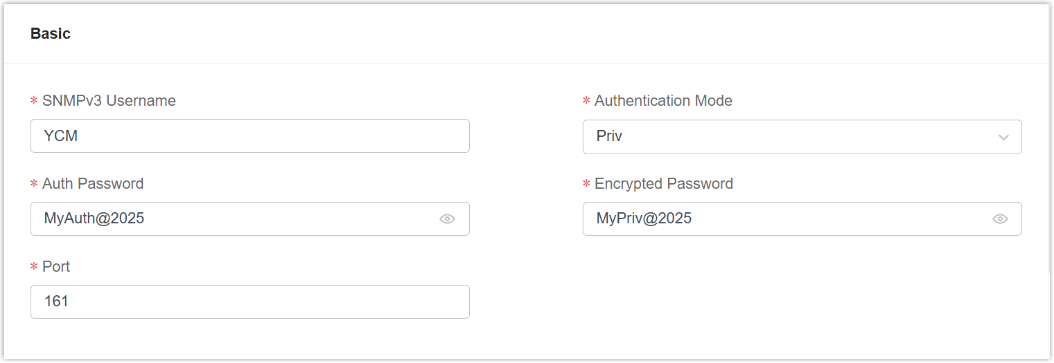 Auth Password Enter a desired password. Note: This option is available only when Authentication Mode is set to Auth or Priv.Encrypted Password Enter a desired password. Note: This option is available only when Authentication Mode is set to Priv.Port Enter the default SNMP port 161, or specify a desired port number. - Optional: To enable Yeastar Central Management to send SNMP trap