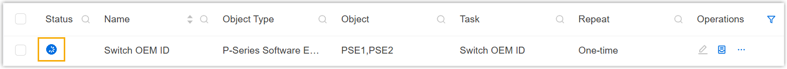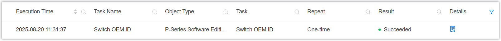 Setting Description Name Enter a name to help you identify the task. Object Type Retain P-Series Software Edition. Task Select Switch OEM ID. Target OEM ID Select the desired OEM ID. Repeat Retain One-time. Execution Time Select the checkbox of Immediately. Timezone The field can not be edited. Creator Your name is automatically filled in, and the field can not be edited. Remark Optional. Add a note to the task. Object The Selected box lists the P-Series Software Editions that you have selected. - Click Save.