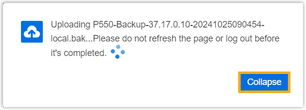 A pop-up window prompts that the backup file is being uploaded, you can click Collapse to collapse the window to the bottom-right corner.