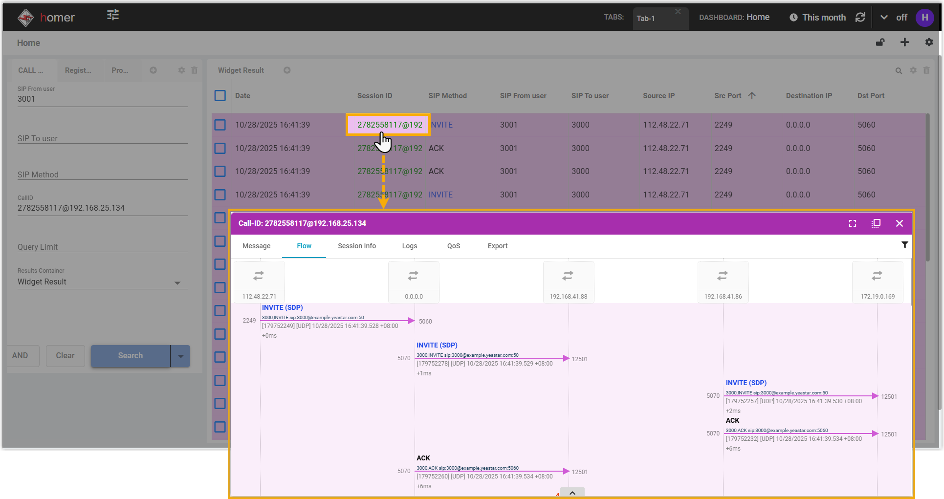 - In the left panel of the Homer dashboard, filter for the target session.Note: The dashboard displays a maximum of 200 records per page, you can use precise search criteria to locate specific sessions.
