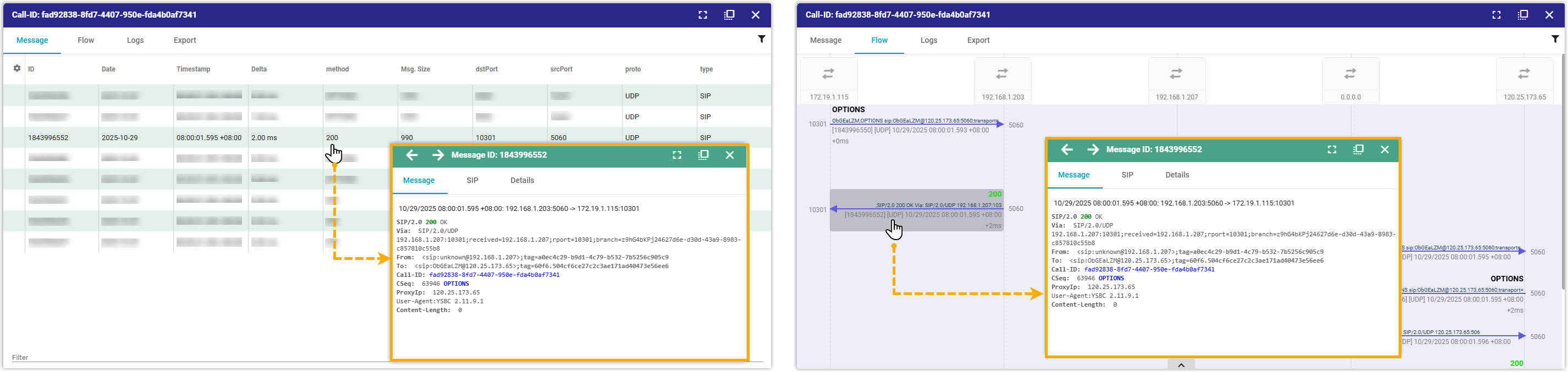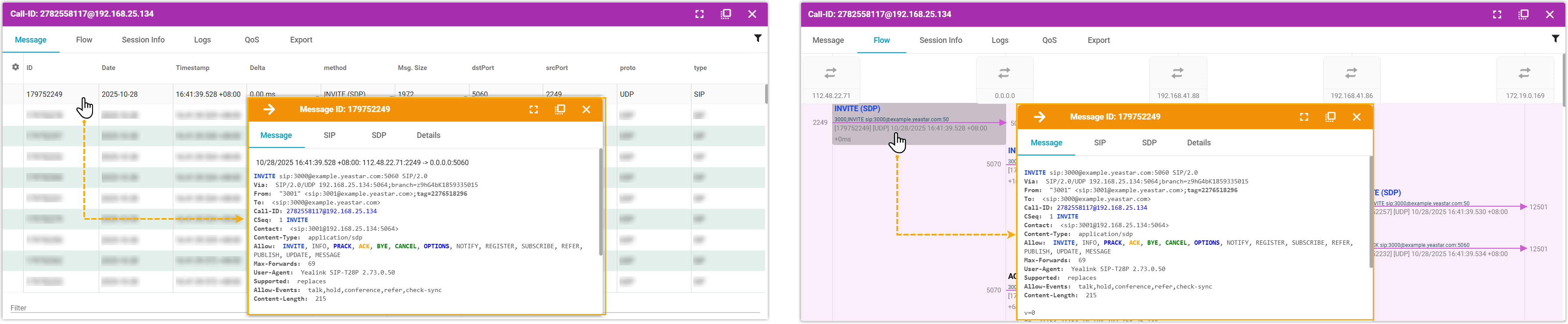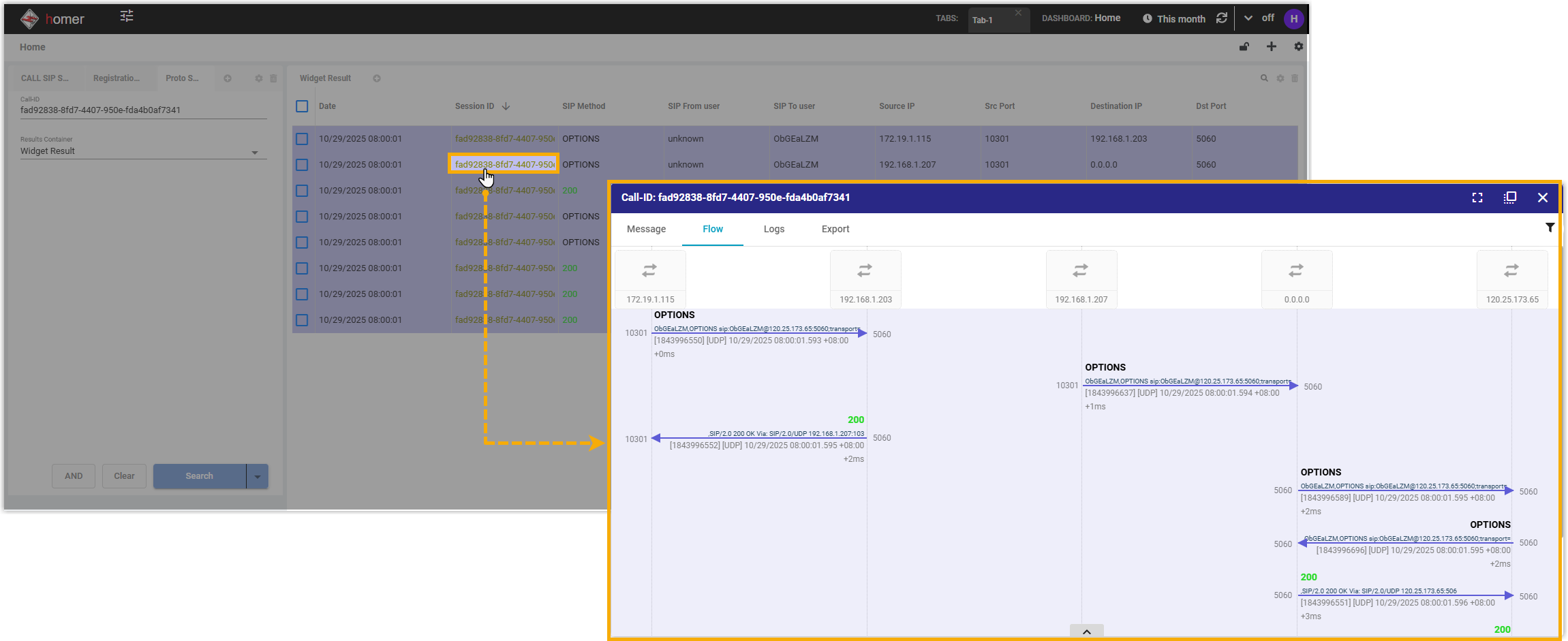 Once connected to Yeastar Central Management, Homer captures all the SIP traffic associated with P-Series Cloud PBXs reported by the cluster servers and presents the data within its web interface for analysis. This topic describes how to use the Homer's intuitive web interface to drill down into the SIP traffic, including raw messages, SIP sequence diagrams, and data export, helping you quickly troubleshoot communication issues through visual data.
