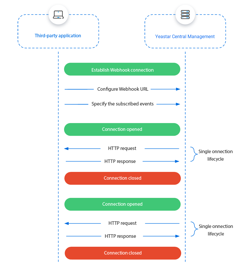 After configuring the Webhook URL and specifying the subscribed events on the Yeastar Central Management, the system will automatically send event details to the third-party application when specified events occur.Every time the system sends a event notification, the