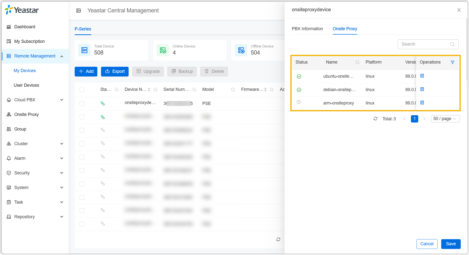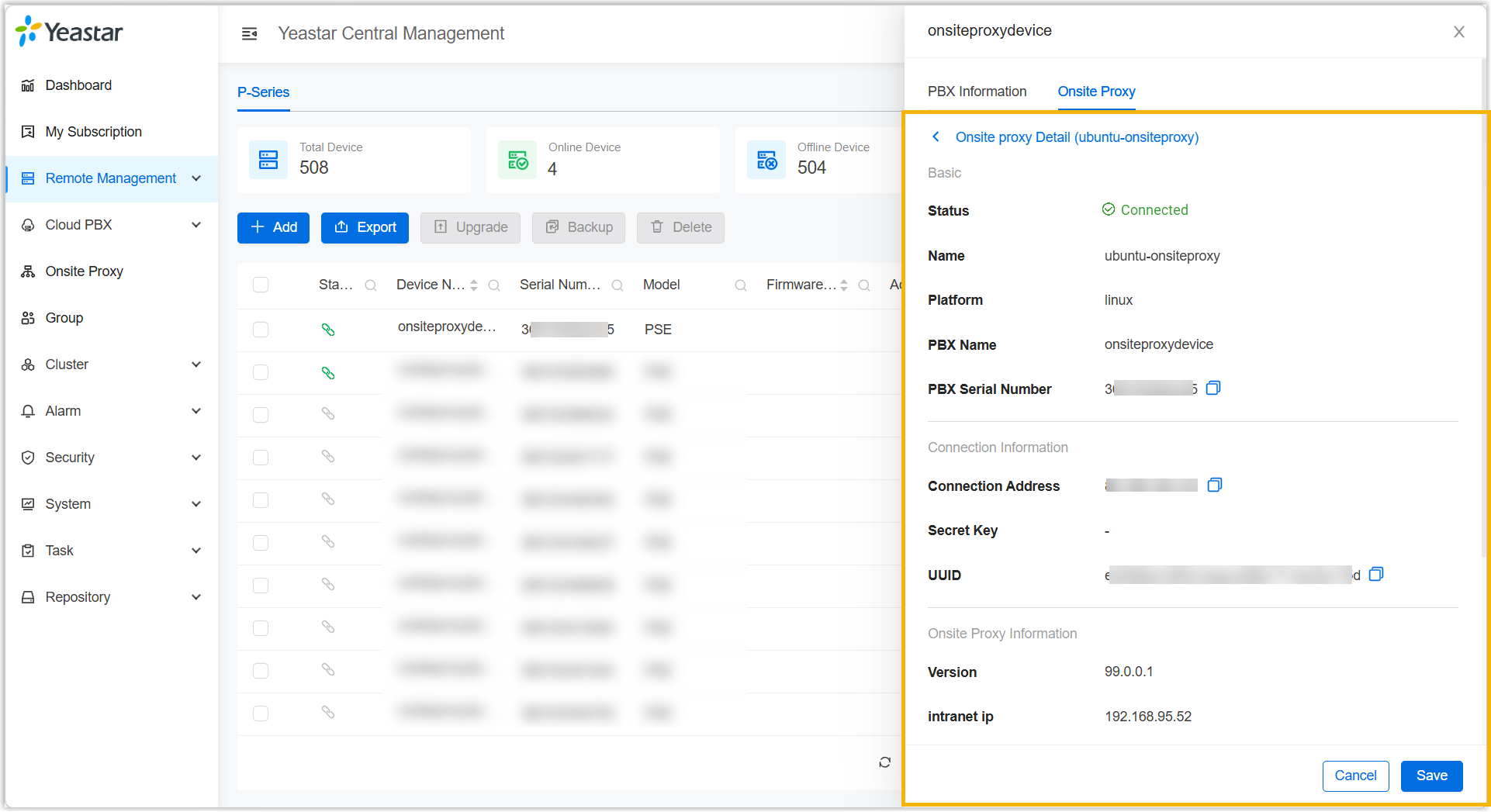 This topic describes how to view Yeastar Onsite Proxy instances associated with a P-series Software Edition and the details of each instance (such as instance name, version number, connection status, etc.).