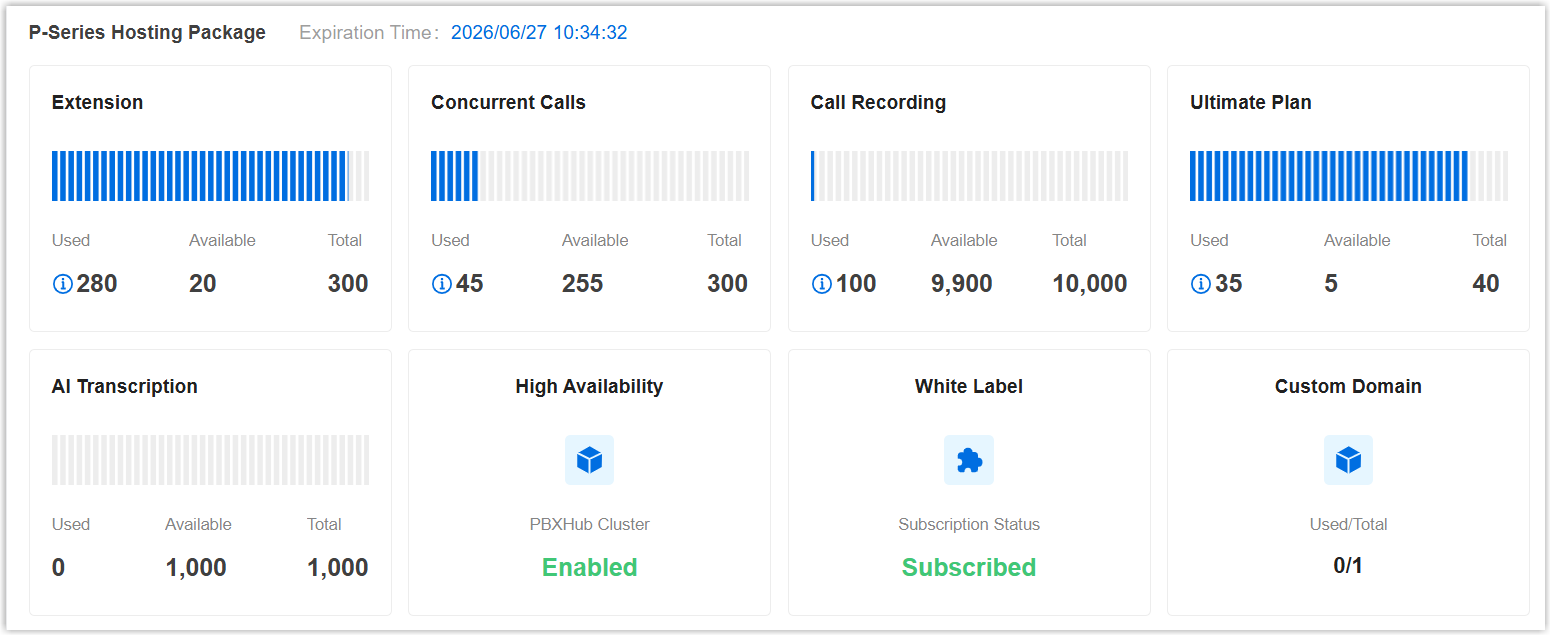 After you purchase hosting package of P-Series Cloud Edition on Yeastar Partner Portal, the subscribed capacity and service are synchronized to your Yeastar Central Management.
