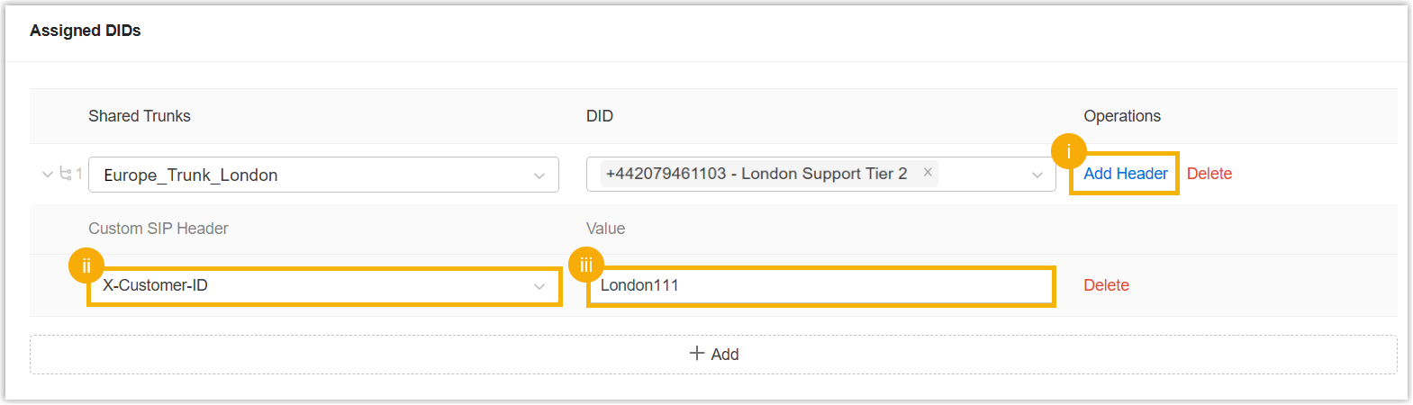 - To assign more custom SIP headers to the Cloud PBX, repeat step i to iii.