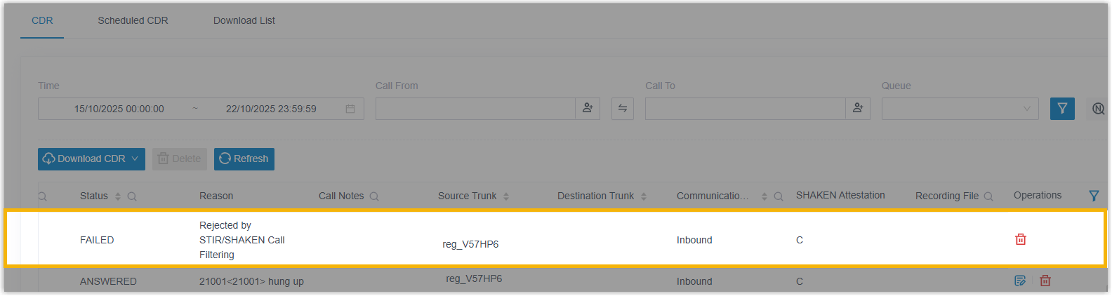 TN-Validation-Failedfrom theverstatparameter and the SHAKEN attestation levelCfrom theP-Attestation-Indicatorparameter. Since either of them matches the rejection criteria configured in the Drop Calls by Verification Status, the inbound call is rejected. - The inbound call filtering results can be checked on the associated PBX.