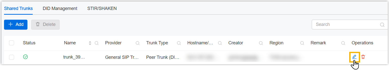 - Log in to Yeastar Central Management, go to Cloud PBX > Trunk Sharing > Shared Trunks.