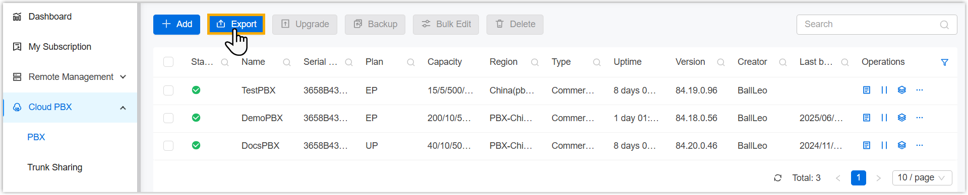 P-Series Cloud PBXs information are exported to a .xlsx file.