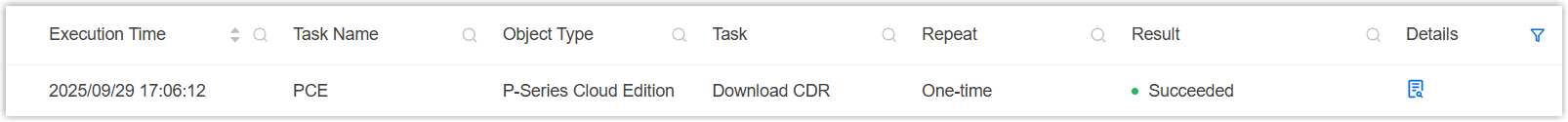 Setting Description Name Enter a name to help you identify the task. Object Type Select P-Series Cloud Edition. Task Select Download CDR. CDR Files Range Choose a time range or specify a custom period to filter CDR. Communication Type Select communication type(s) to filter CDR. - All: Download CDRs of all communication types.