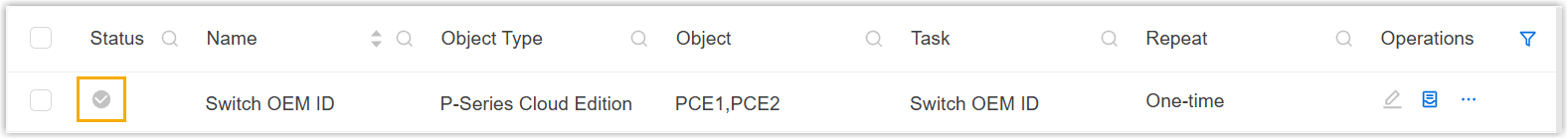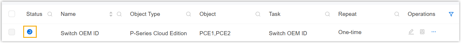 Setting Description Name Enter a name to help you identify the task. Object Type Retain P-Series Cloud Edition. Task Select Switch OEM ID. Target OEM ID Select your OEM ID. Repeat Select One-time. Execution Time Select the checkbox of Immediately. Timezone The field can not be edited. Creator Your name is automatically filled in, and the field can not be edited. Remark Optional. Add a note to the task. Object The Selected box lists the P-Series Cloud PBXs that you have selected. - Click Save.