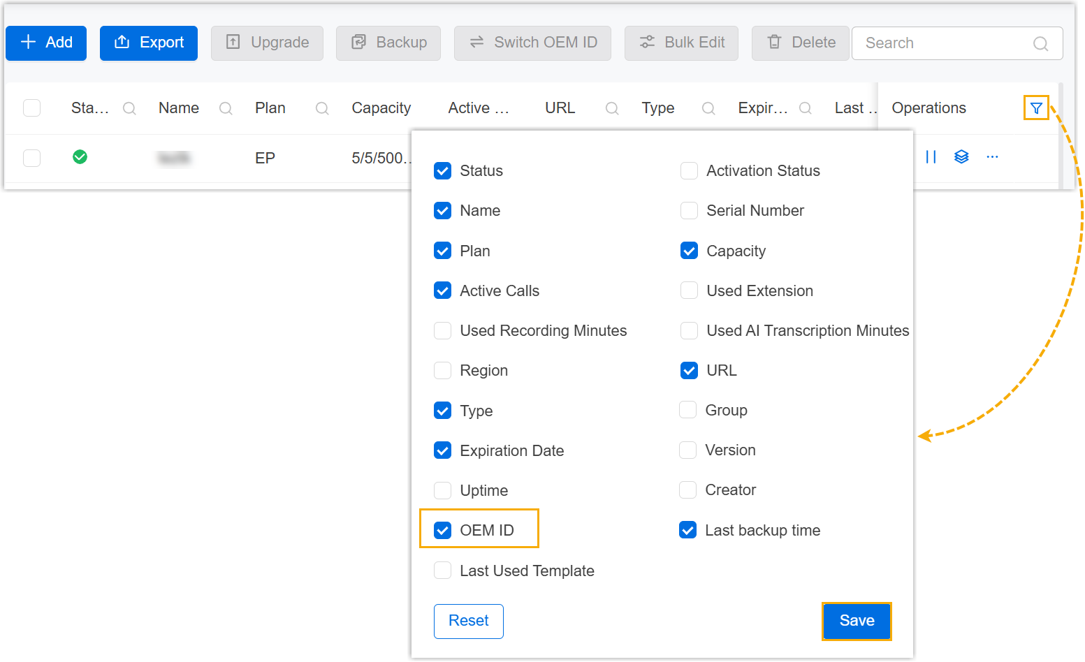 - In the Cloud PBX list, set the column to display PBX's OEM ID.