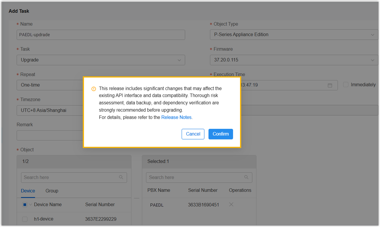 | Updated | Updated description for Task: When creating a task for upgrading a P-Series PBX system to a version with significant changes, the system will displays a pop-up window, reminding you to perform thorough risk assessment, data backup, and dependency verification before updating. | ![]() |