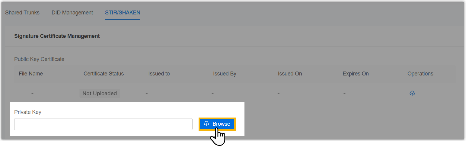 Browse to upload the private key.Note: The private key must correspond to the public key in the SHAKEN certificate.