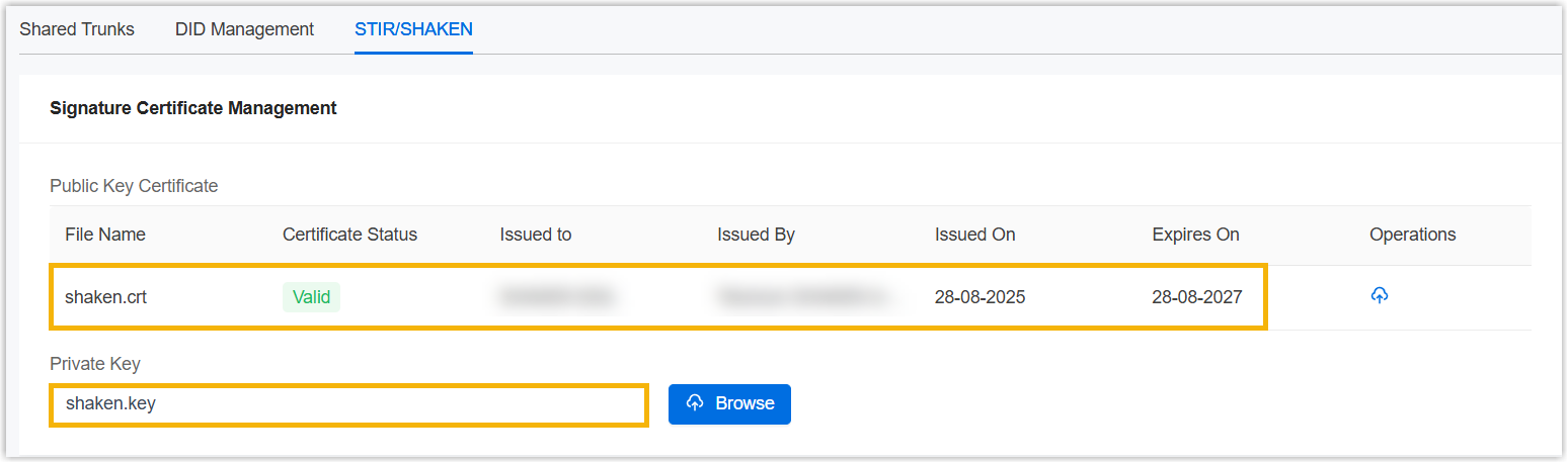 Before enabling outbound call signing feature, you need to upload a private key for signing and its corresponding SHAKEN certificate for the called party to verify call authenticity in Yeastar Central Management.