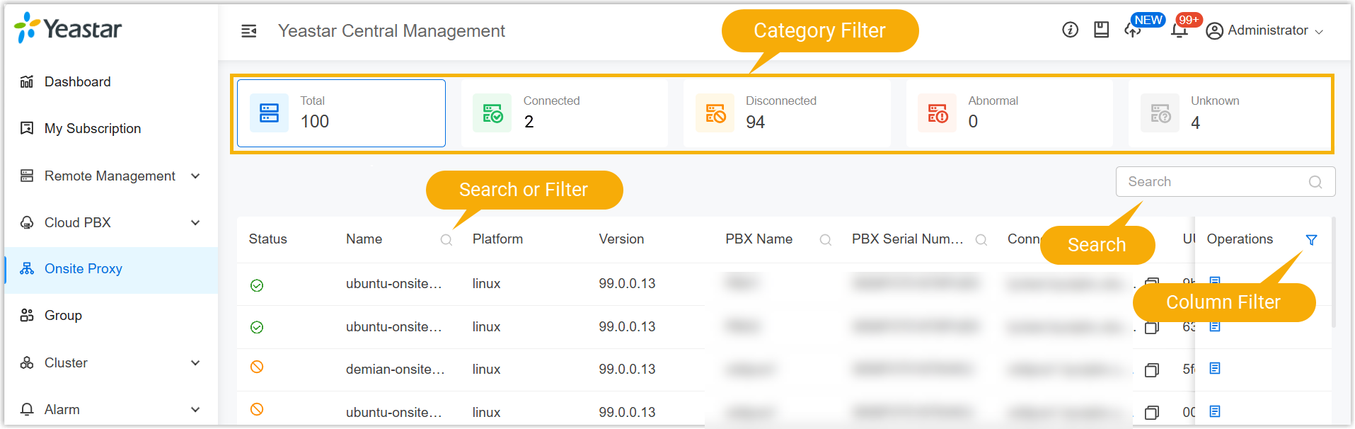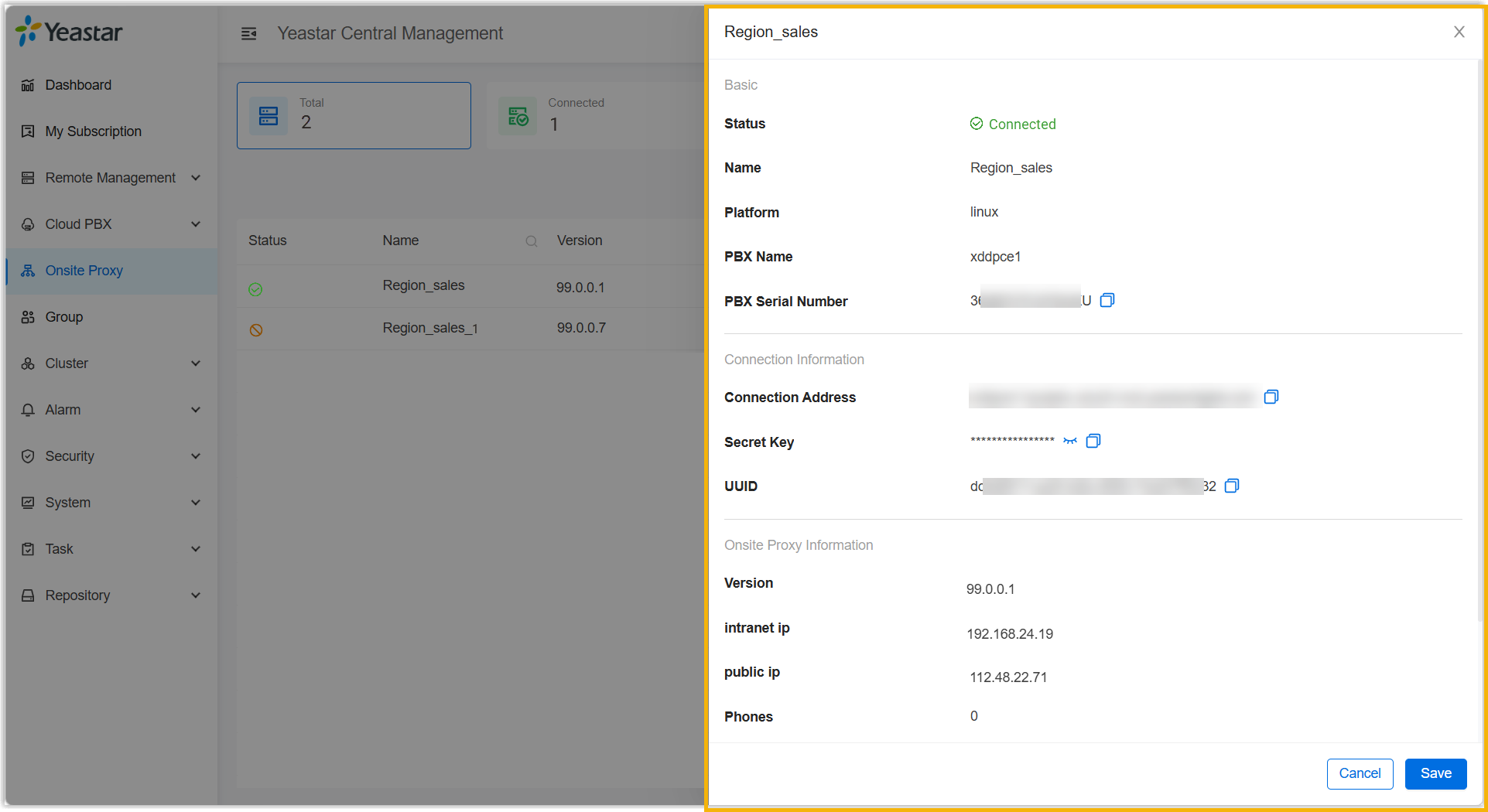 - Log in to Yeastar Central Management, go to Onsite Proxy.
