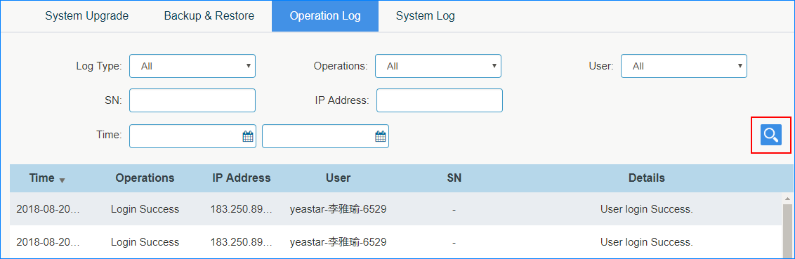 - SN: To search operation logs for a specific PBX, enter the PBX's SN.