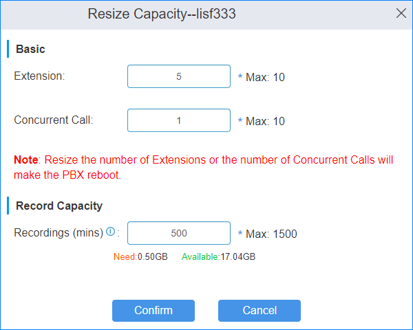 Note: If you change the Extension capacity or the Concurrent Call capacity, the PBX will reboot automatically to take effect.