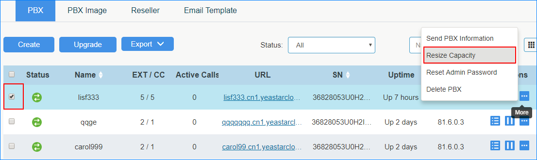 According to your customer's requirements, you can resize the Extension capacity, Concurrent Call capacity, and Call Recording capacity of the customer's PBX.
