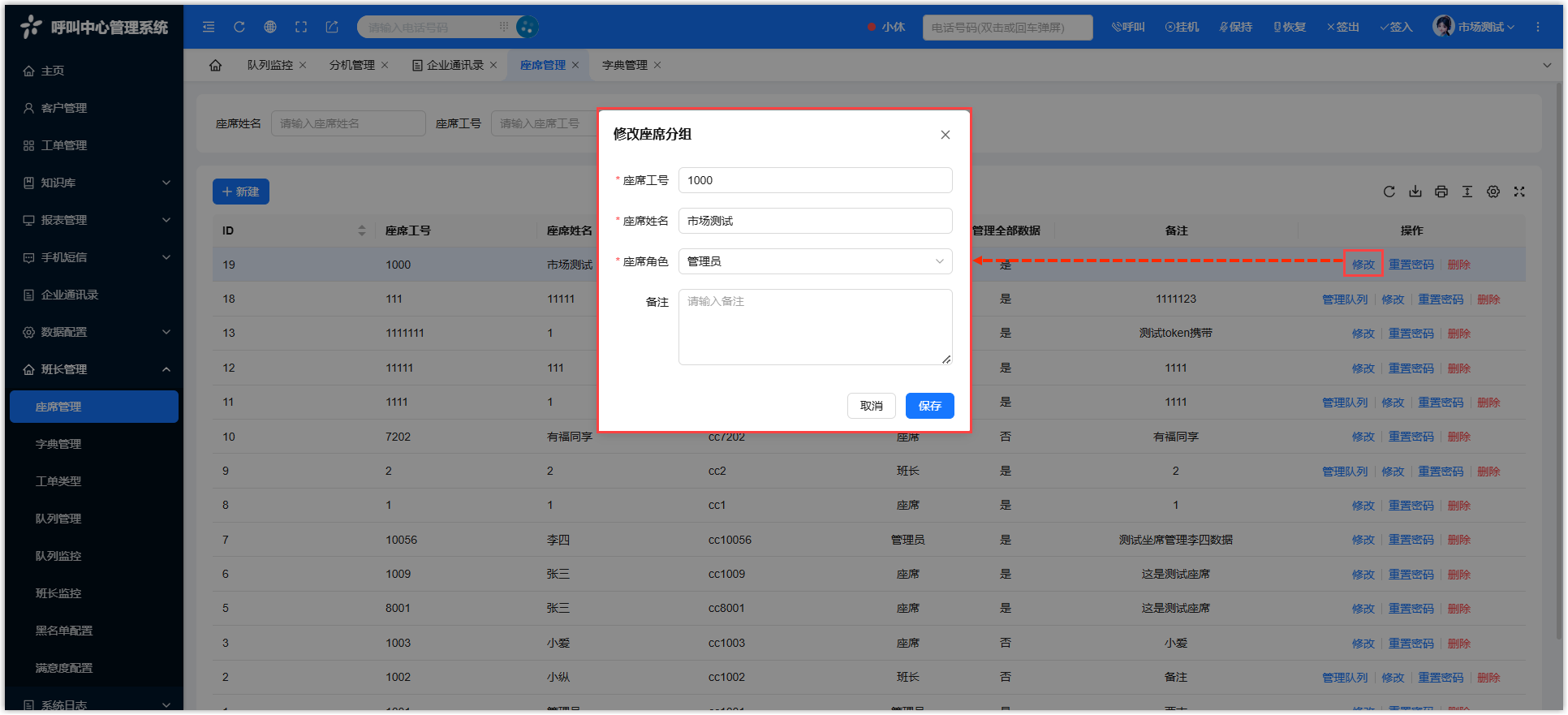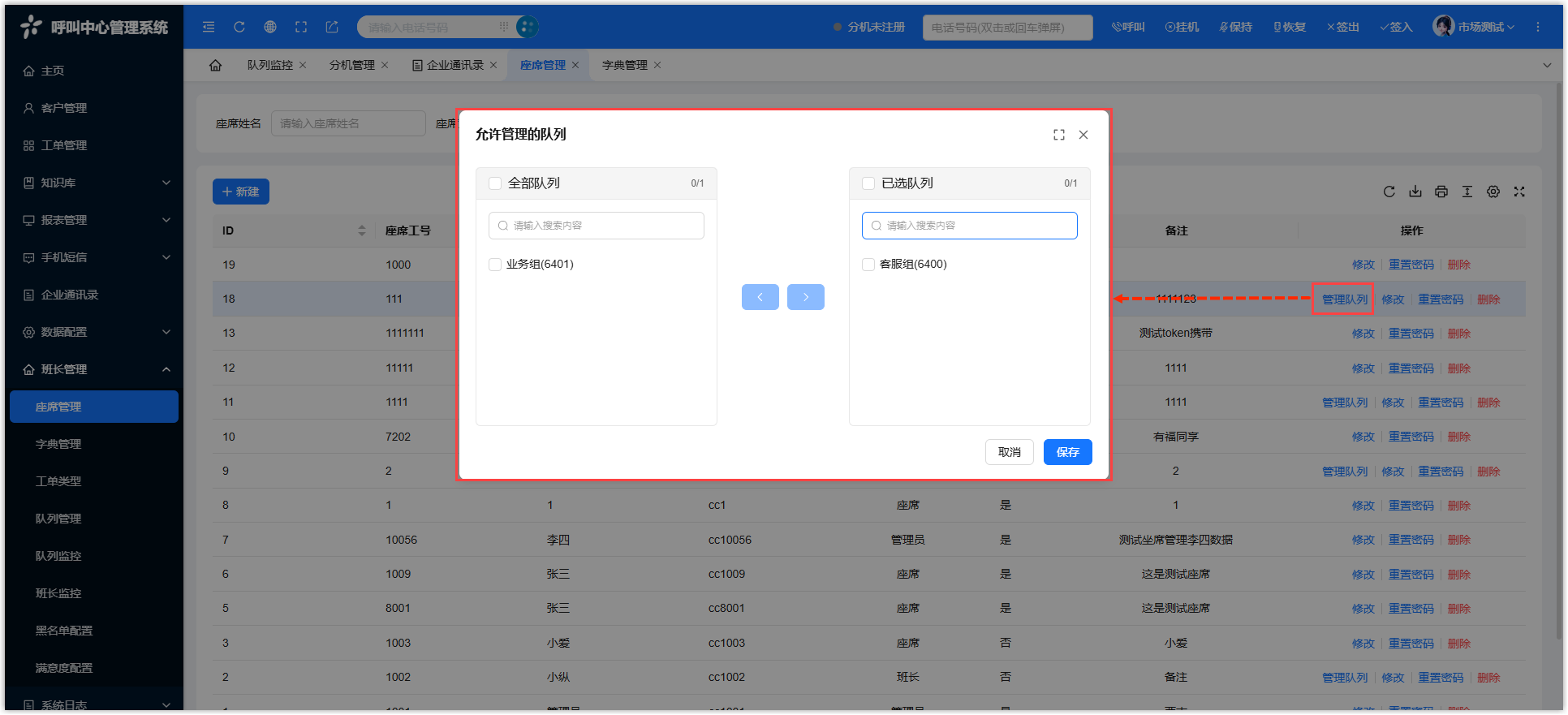 - 修改允许管理的队列。注: 只有座席角色为班长的时候才有管理队列权限。