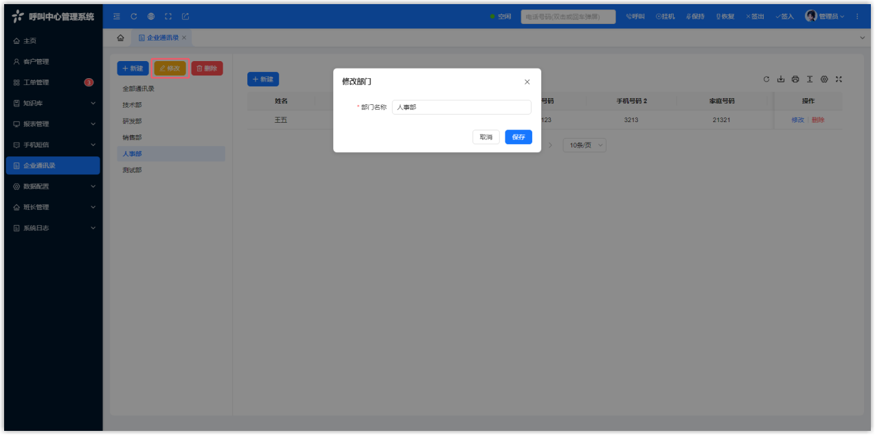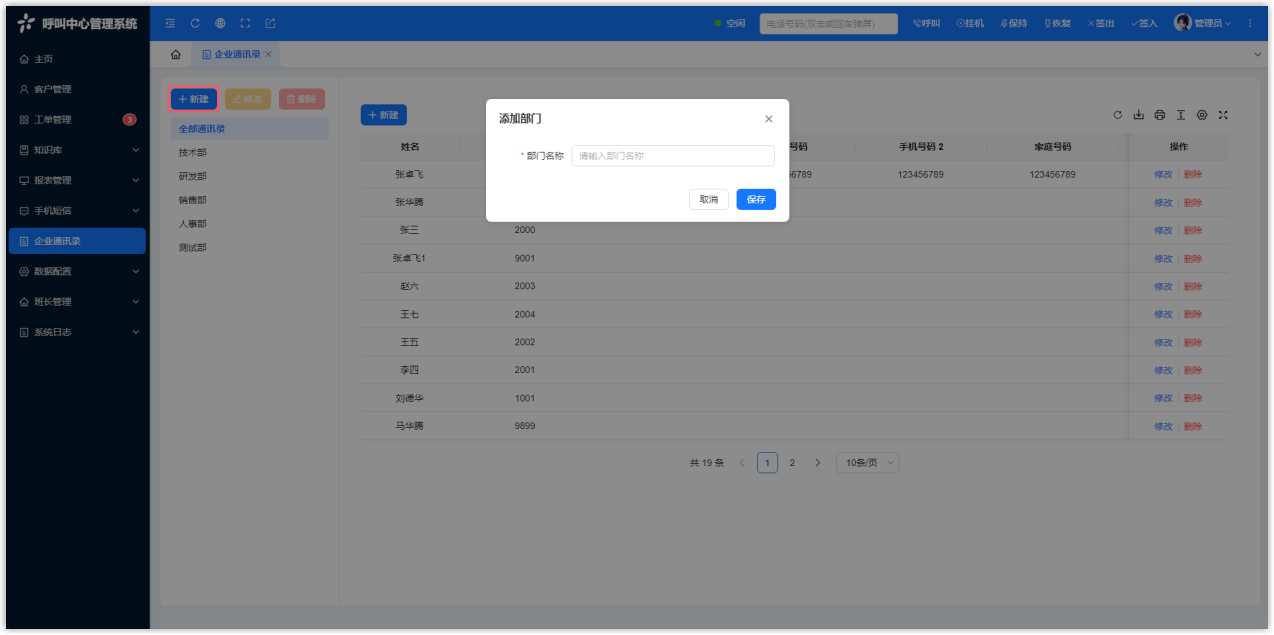 企业部门 添加企业部门 前往 企业通讯录 > 左侧部门列表,点击 新建。 输入部门名称。 点击 保存。 修改企业部门 前往 企业通讯录 > 左侧部门列表,点击 修改。 选择要修改的企业部门。注: 全部通讯录 不能进行修改操作。 点击 保存。 删除企业部门 前往 企业通讯录 > 左侧部门列表。 选择要删除的企业部门,点击 删除。 注: 全部通讯录 不能进行删除操作。
