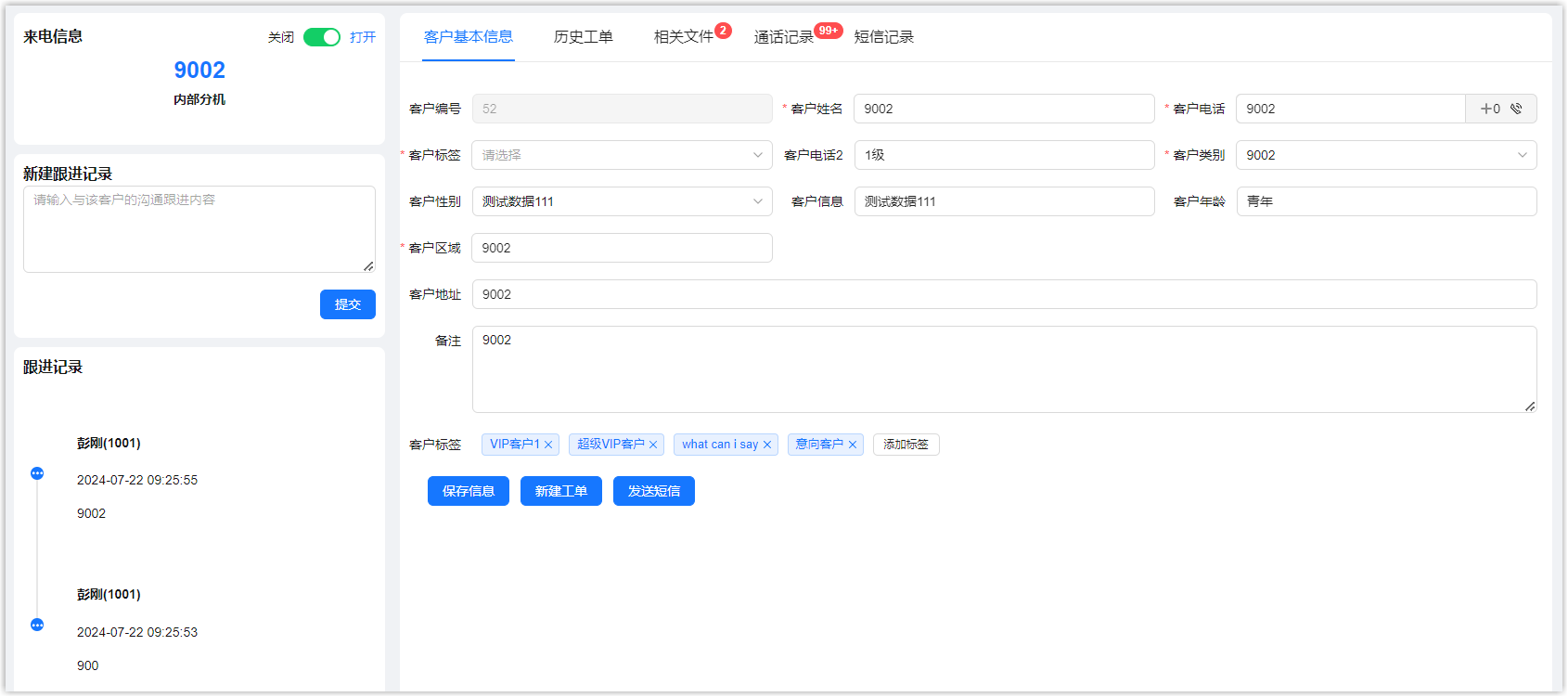 客户来电或坐席主动呼出时,系统自动弹出客户资料。你可以在线编辑客户信息,创建客户工单、订单,老客户再次来电时可以查看历史服务记录,提高座席服务质量和效率。
