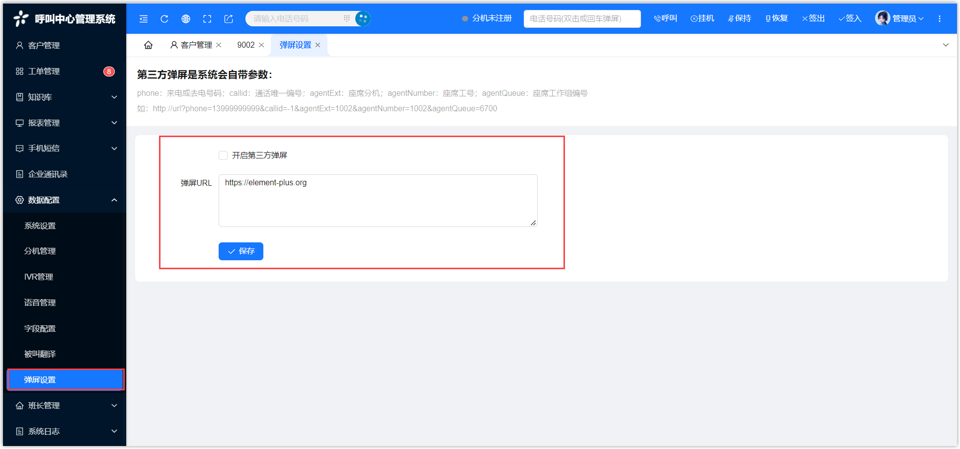 http://url?phone=13888888888&callid=-1&agentExt=1202&agentNumber=1202&agentQueue=6700。注: 第三方弹屏是系统会自带参数: