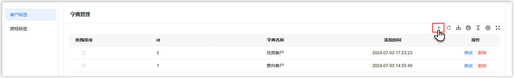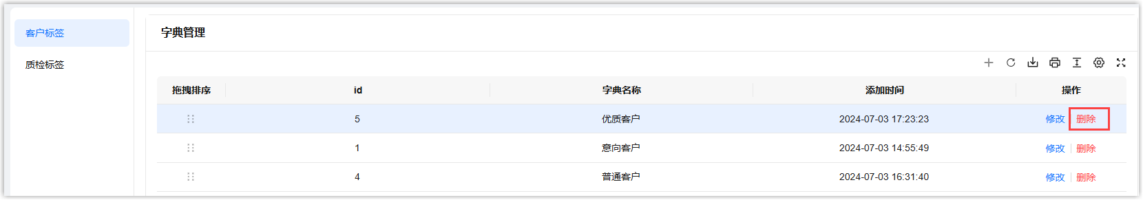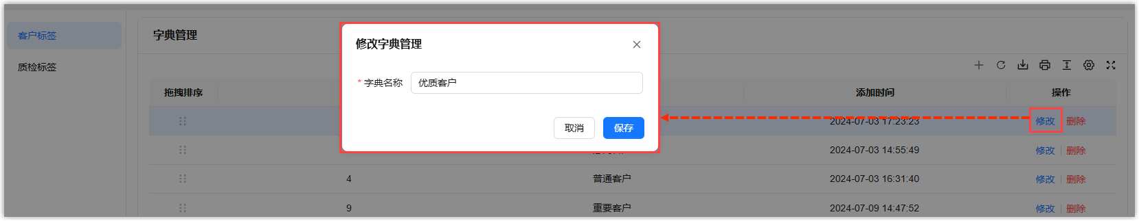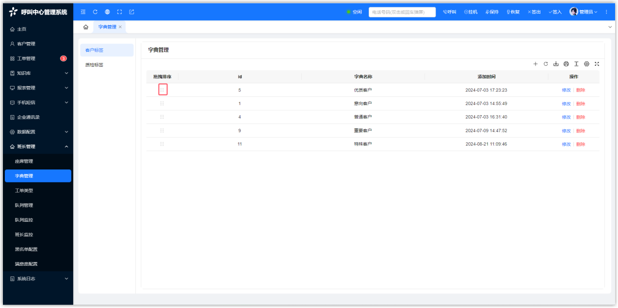 字典管理 拖拽排序 前往 班长管理 > 字典管理。 鼠标移到 图标处按下鼠标左键不松开进行拖拽。 松开鼠标左键之后排序成功。 添加字典管理 前往 班长管理 > 字典管理,点击 新建。 输入 字典名称。 点击 保存。 修改字典管理 前往 班长管理 > 字典管理。 选择要修改的字典,点击 修改。 修改字典后,点击 保存。 删除字典管理 前往 班长管理 > 字典管理。 选择要删除的字典,点击 删除。