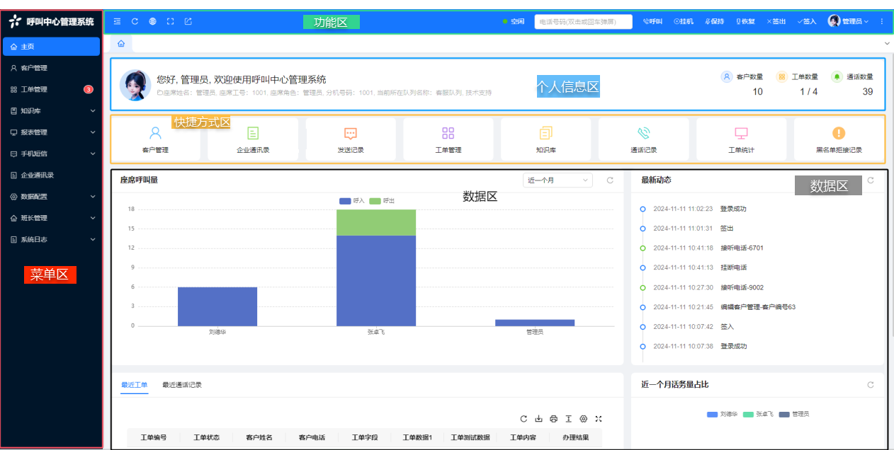 | 数据区 | 快速查阅座席呼叫量和近一个月话务占比量,以及最新日志动态、最近工单和最近通话记录。 注: 数据区和快捷方式区可以随意拖拽切换位置,拖拽完如果想切换回初始样式,可以点击主页最底部的重置布局按钮。 |