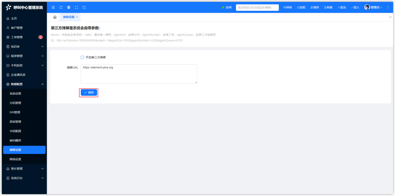设置呼叫中心对接 PBX 的地址以及设置显示水印和弹屏功能。