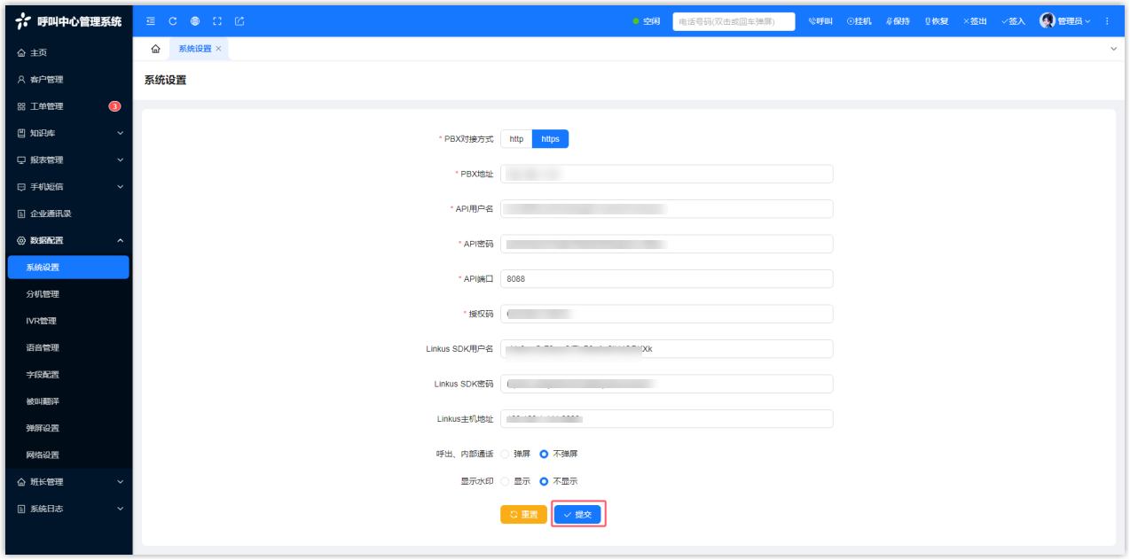 系统设置 设置呼叫中心对接 PBX 的地址以及设置显示水印和弹屏功能。 前往 数据配置 > 系统设置,选择 PBX 对接方式。 输入 PBX 地址、API 用户名、API 密码、AP I端口、授权码。 输入 Linkus SDK 用户名、Linkus SDK 密码、Linkus 主机地址。 选择是否启用呼出弹屏和显示水印功能。 点击 提交。