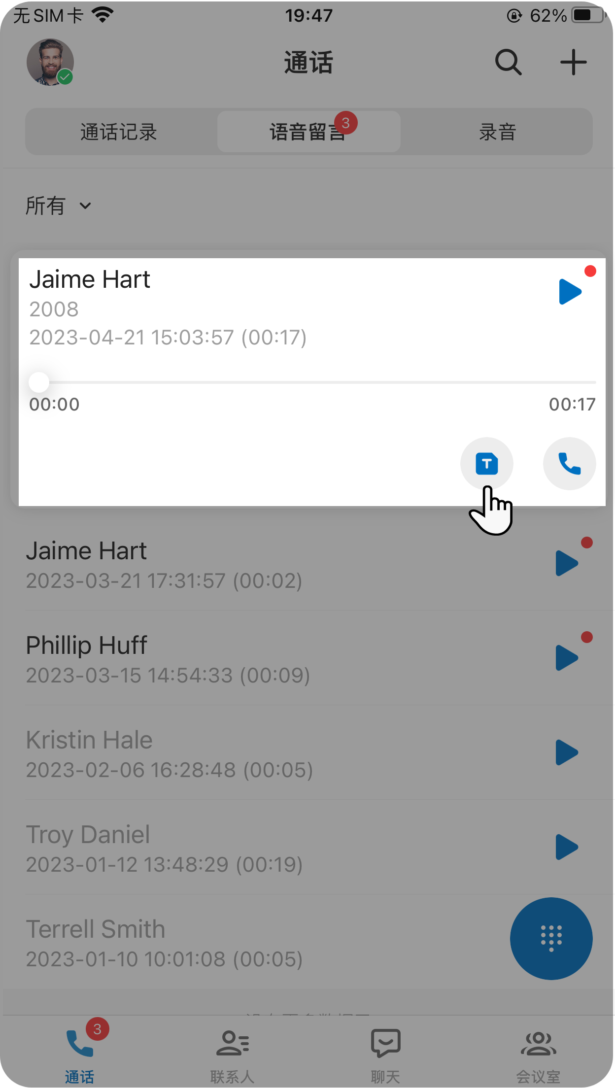 - 在列表中,查看和管理语音留言信息。