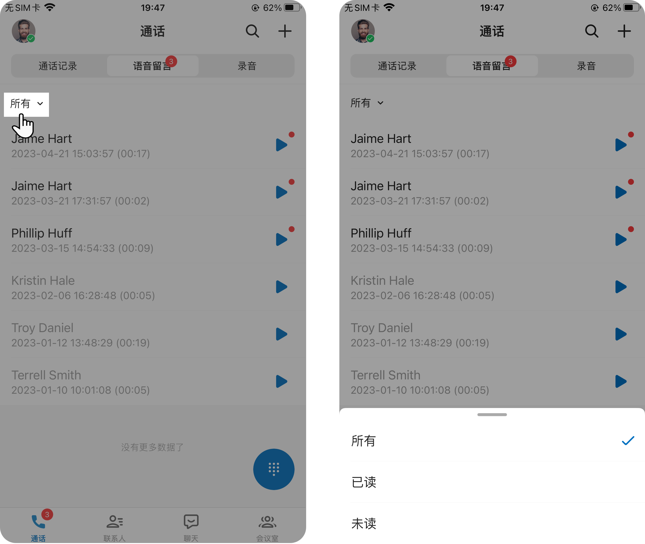- 可选: 在左上角,选择读取状态以筛选语音留言信息。