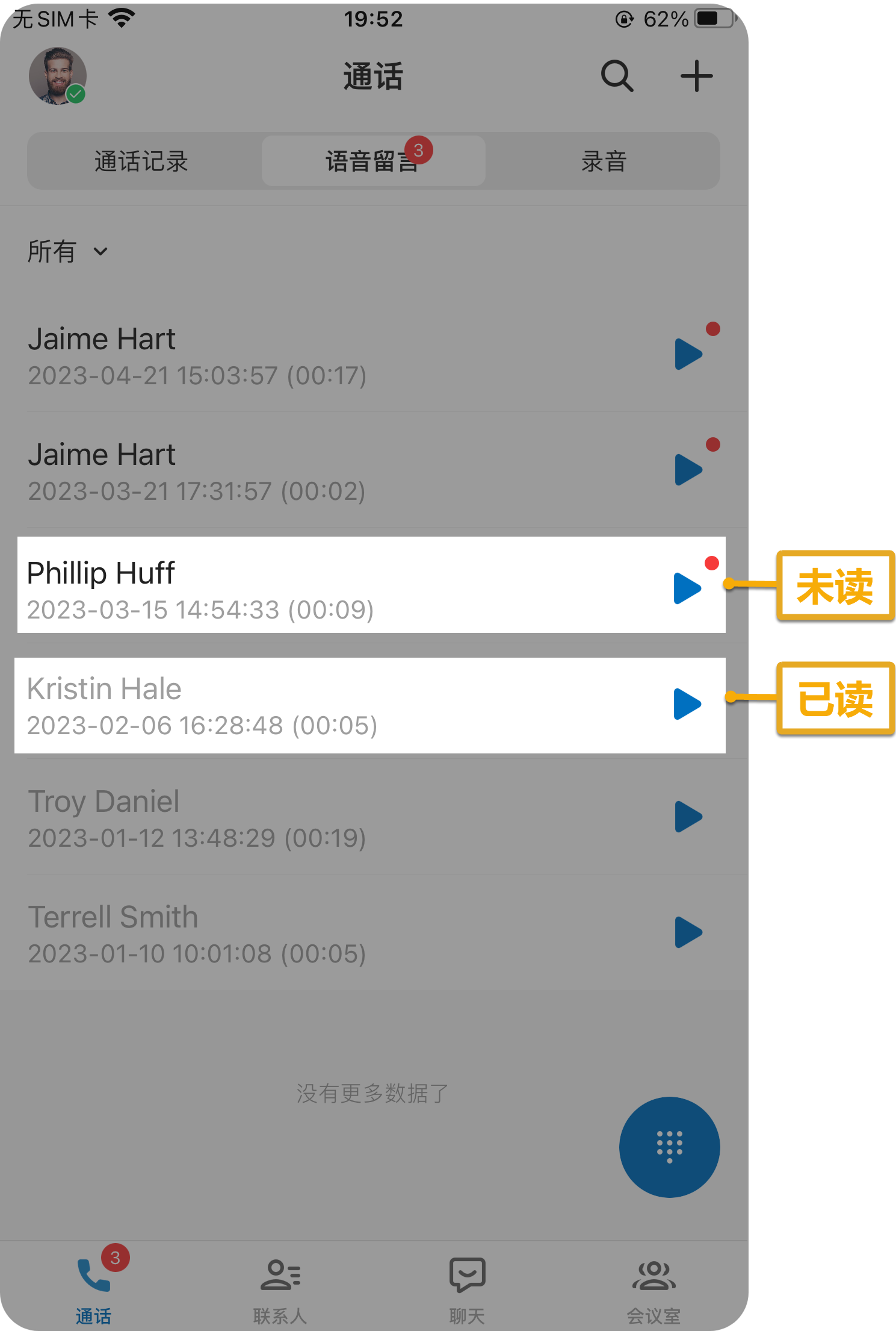 ),而已读的语音留言信息会被置灰。