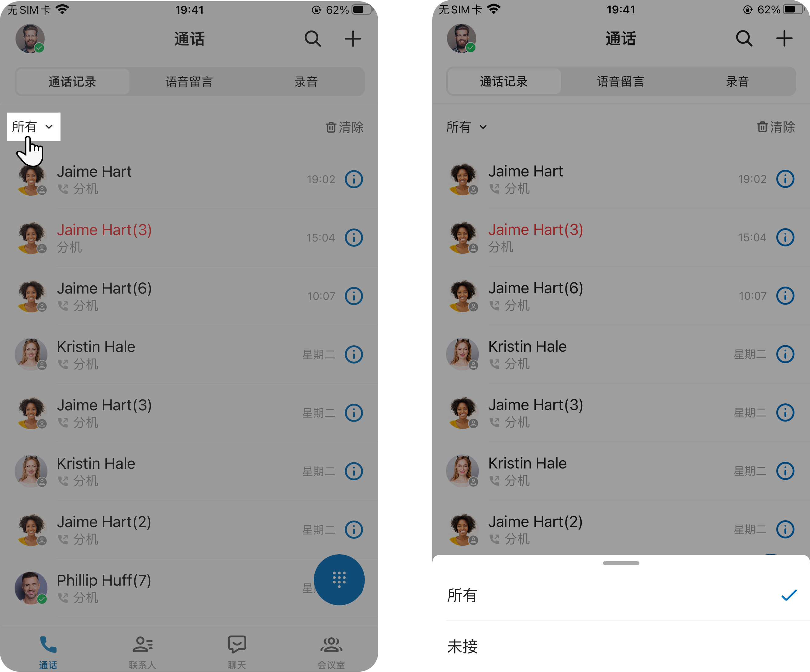 - 可选: 在左上角,选择通讯类型以筛选通话记录。
